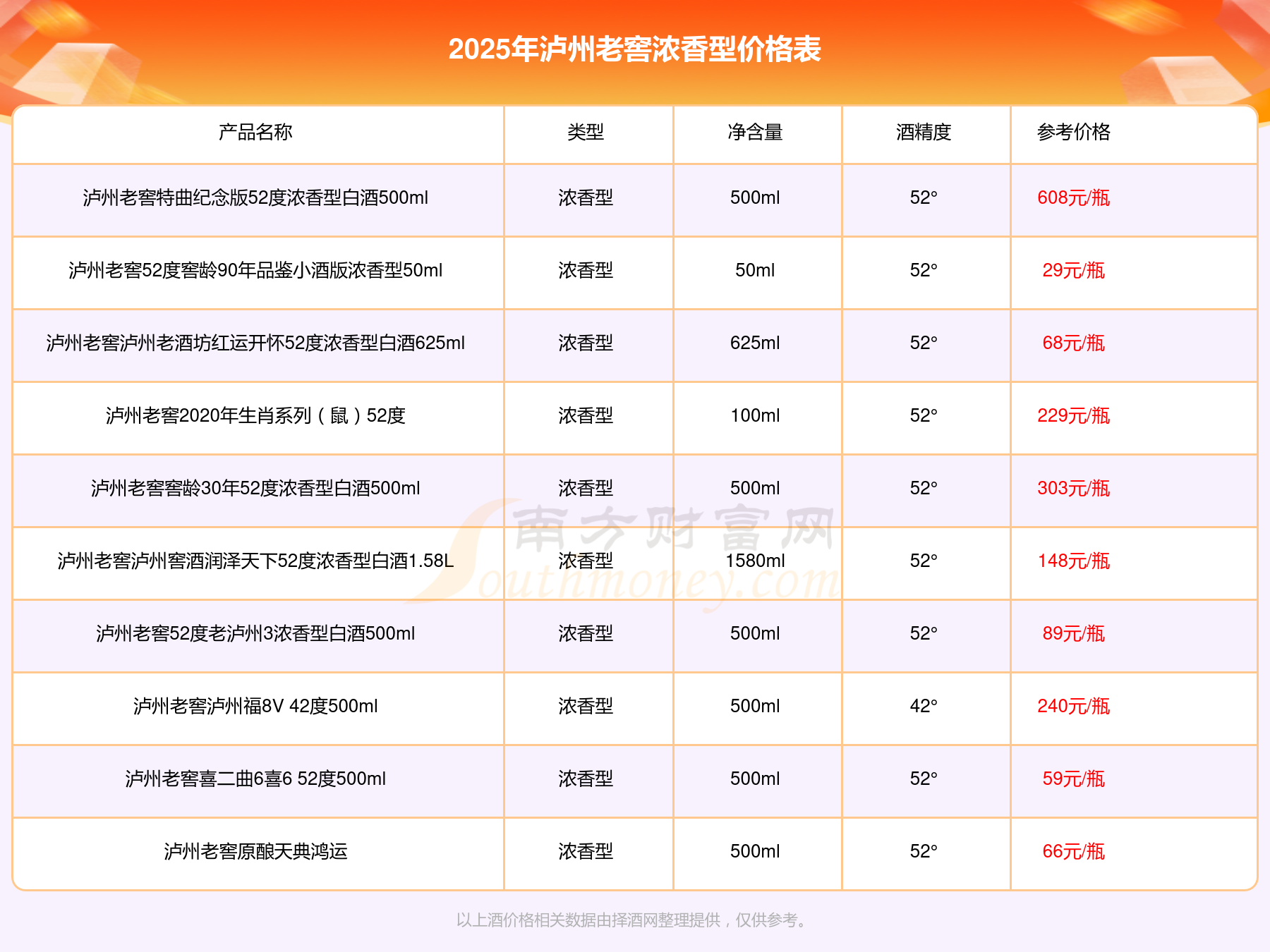 2025泸州老窖浓香型酒最新价格:泸州老窖国窖1573春酿鼠兆丰年E 55度参考价17999元/瓶、泸州老窖国窖1573生命中的那坛酒55度014参考价9999元/瓶、泸州老窖国窖1573春酿鼠兆丰年A 55度参考价5088元/瓶、泸州老窖国窖1573生命中的那坛酒55度013浓香型白酒1000ml参考价4988元/瓶、泸州老窖国窖1573生命中的那坛酒55度009 1000ml参考价4288元/瓶。