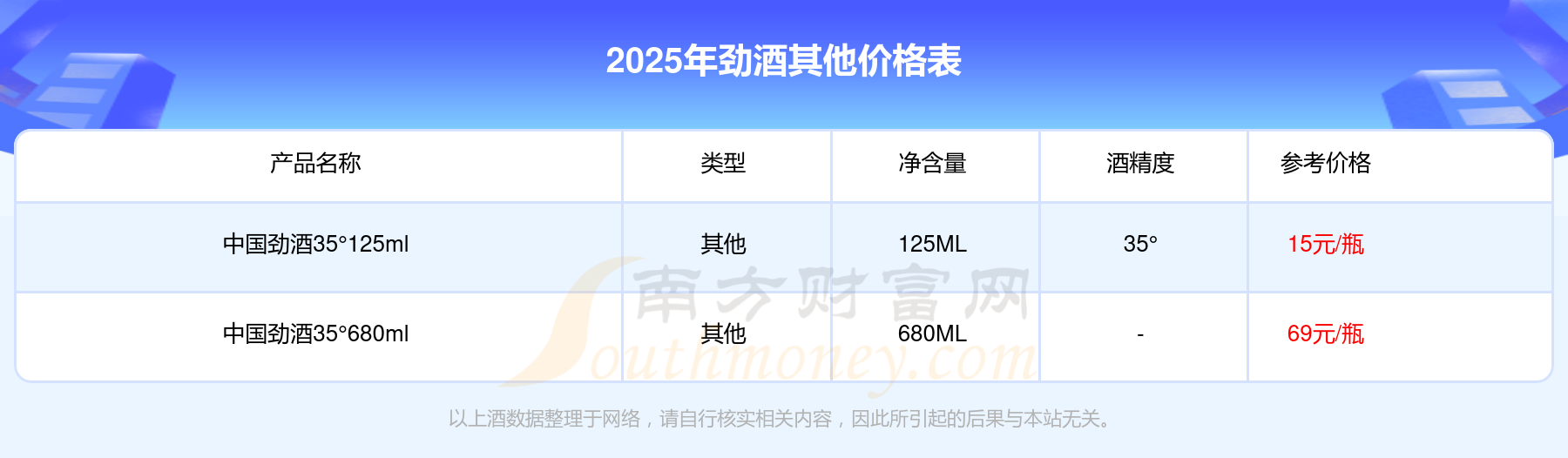 2025年劲酒其他酒中国劲酒35°680ml、中国劲酒35°125ml等最新价格如下: