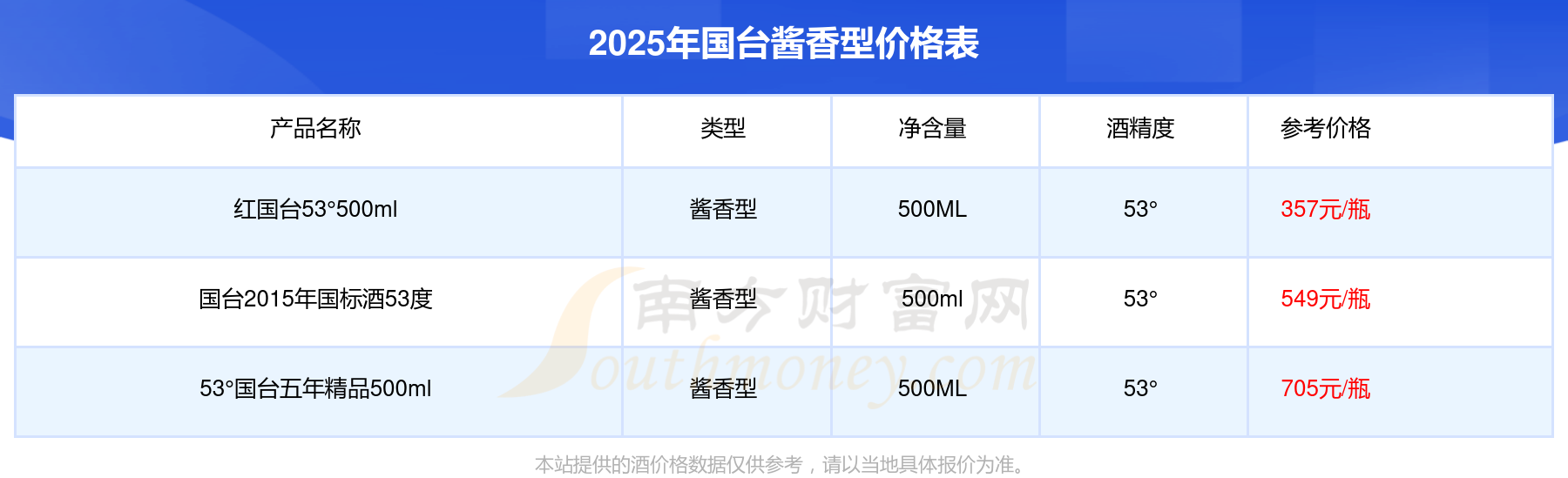 2025年国台酱香型价格最高的酒是53°国台五年精品500ml,参考价705元/瓶,最低的是红国台53°500ml,参考价357元/瓶,价格高低差为348元/瓶。