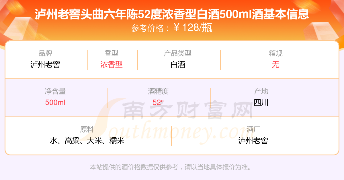 泸州老窖头曲六年陈52度浓香型白酒500ml基本信息