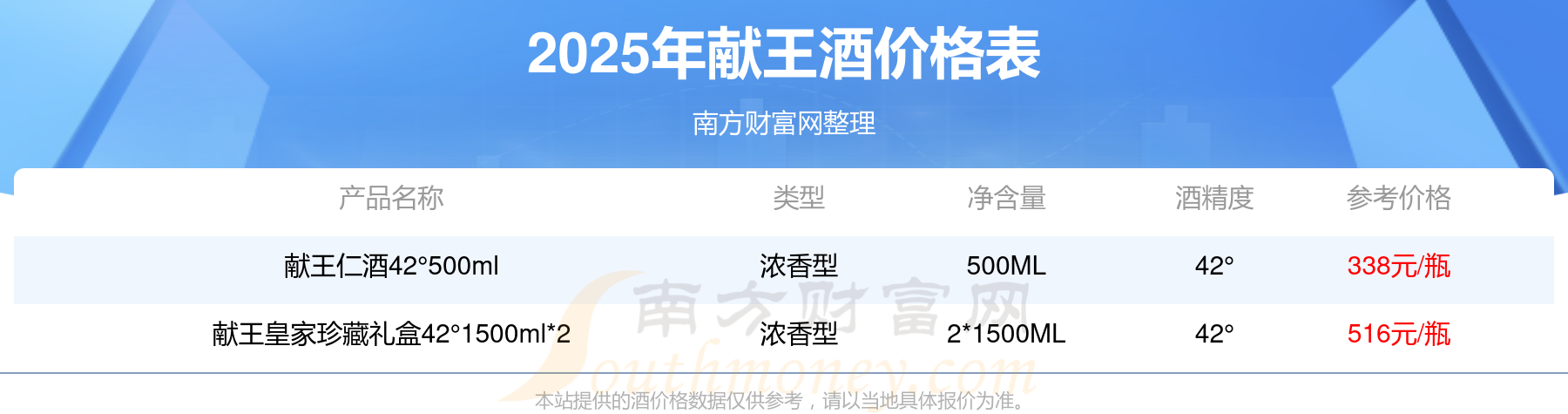 2025年献王价格最高的酒是献王皇家珍藏礼盒42°1500ml*2,参考价516元/瓶,最低的是献王仁酒42°500ml,参考价338元/瓶,价格高低差为178元/瓶。