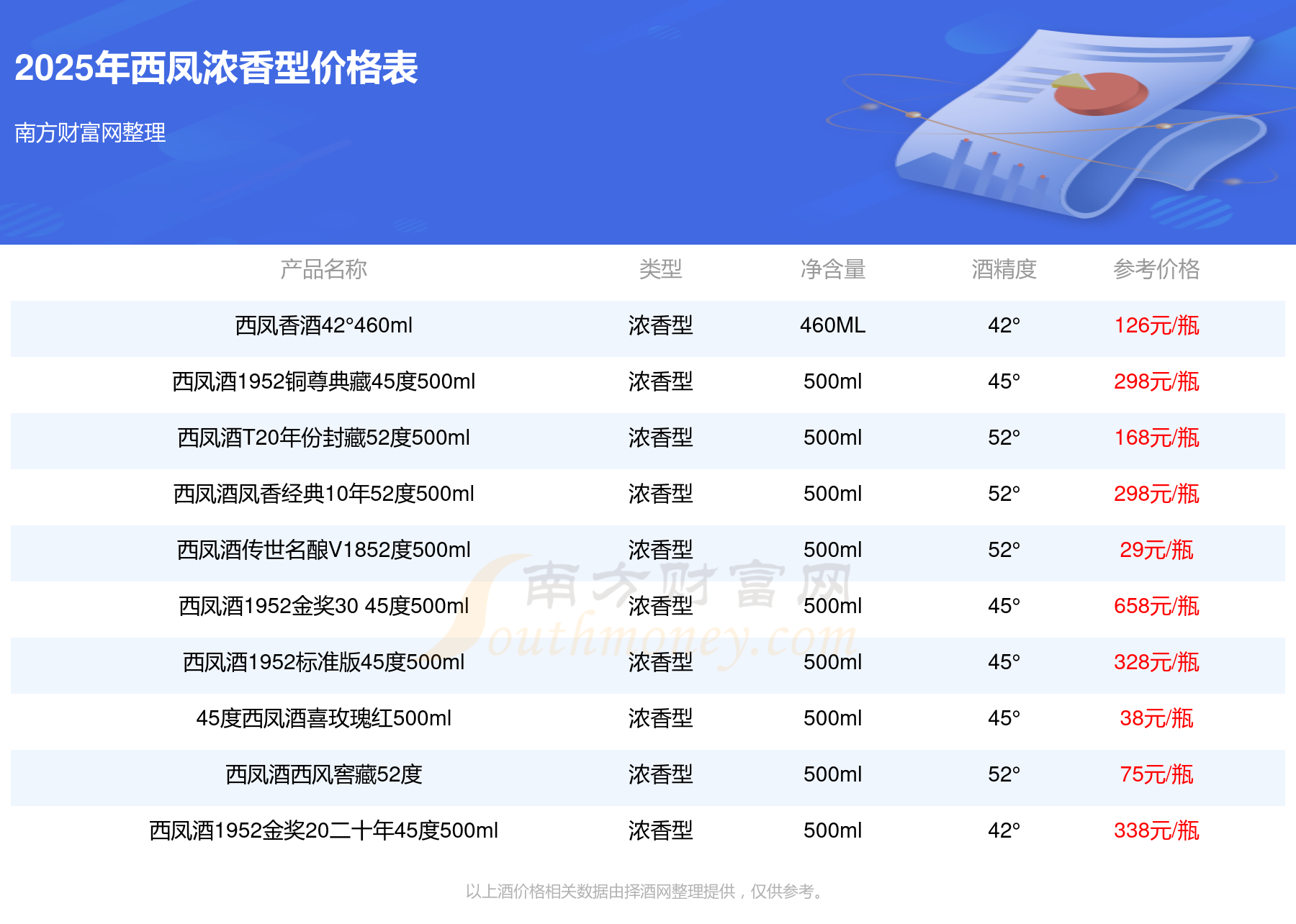 西凤酒 酒海私藏55度3000ml参考价8880元/瓶、西凤酒1952金奖50 55度500ml参考价2380元/瓶、西凤酒2013年产老酒凤香经典30年52度500ml参考价1280元/瓶、西凤酒1952金奖30 55度500ml参考价898元/瓶、西凤酒凤香经典20年52度500ml参考价768元/瓶、西凤酒1952金奖30 45度500ml参考价658元/瓶、西凤酒1956纪念版52度500ml参考价498元/瓶、西凤酒1956宝石藏45度500ml参考价488元/瓶。