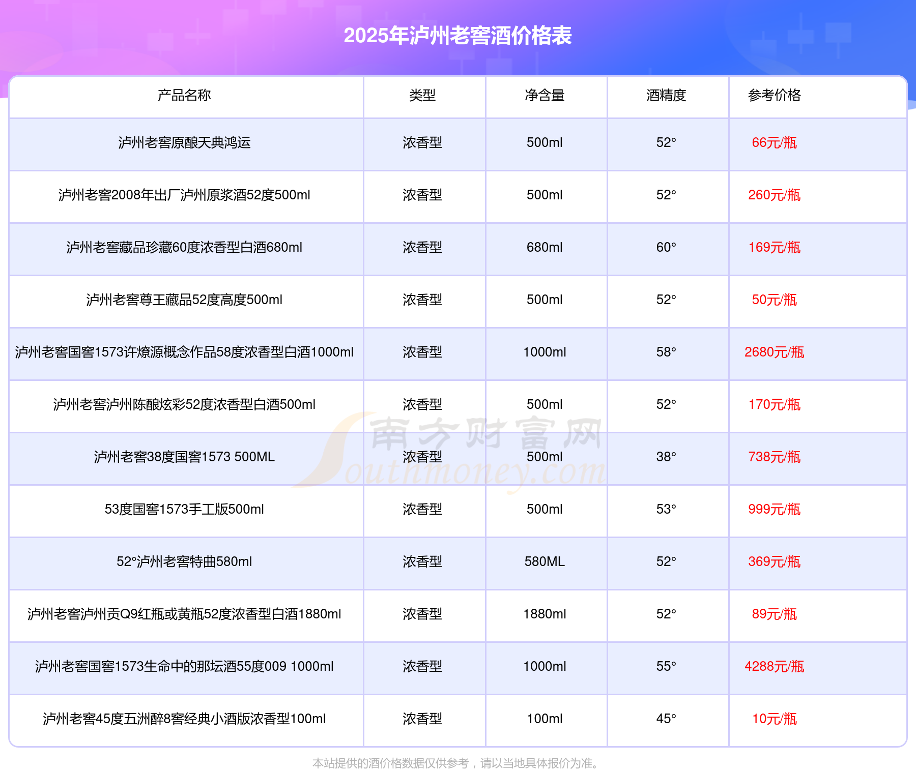 泸州老窖酒价格最高的是泸州老窖国窖1573春酿鼠兆丰年E 55度,参考价17999元/瓶,最低的是泸州老窖45度五洲醉8窖经典小酒版浓香型100ml,参考价10元/瓶,价格高低差为17989元/瓶。