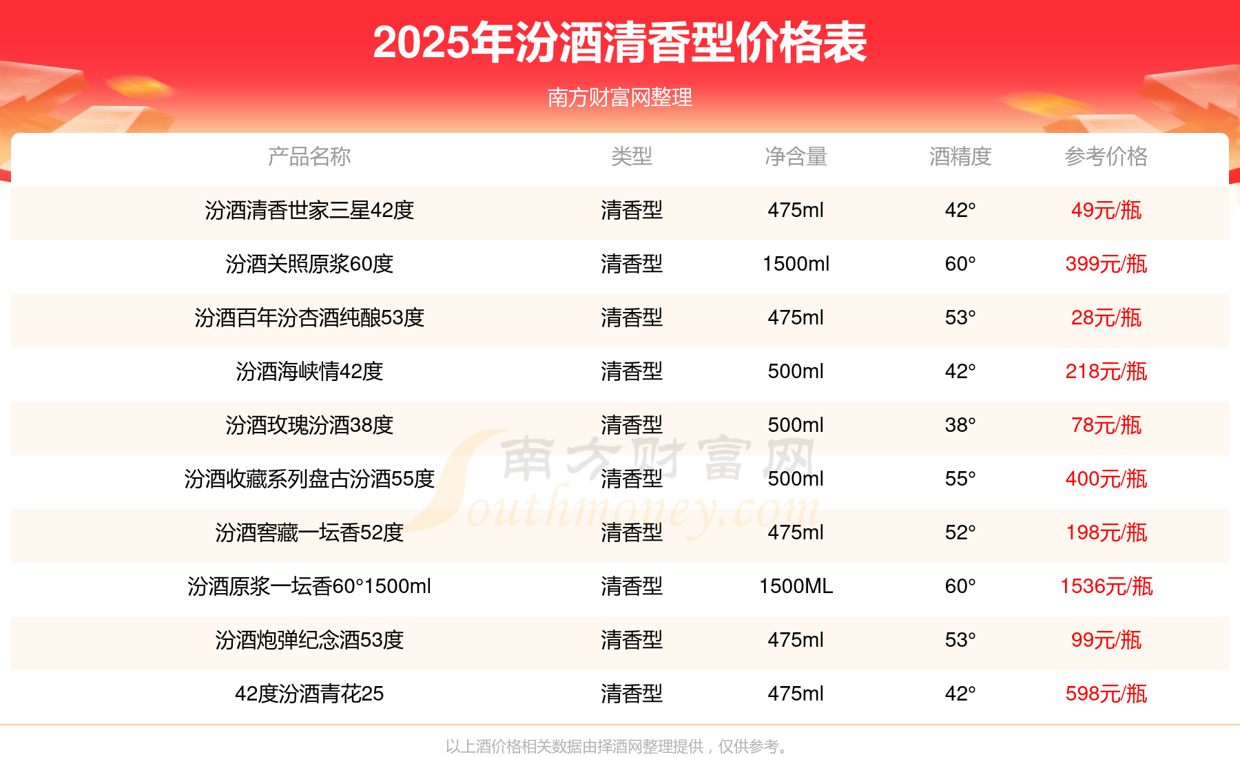 2025年汾酒清香型价格最高的酒是汾酒原浆一坛香60°3000ml,参考价2180元/瓶,最低的是汾酒百年汾杏酒纯酿53度,参考价28元/瓶,价格高低差为2152元/瓶。