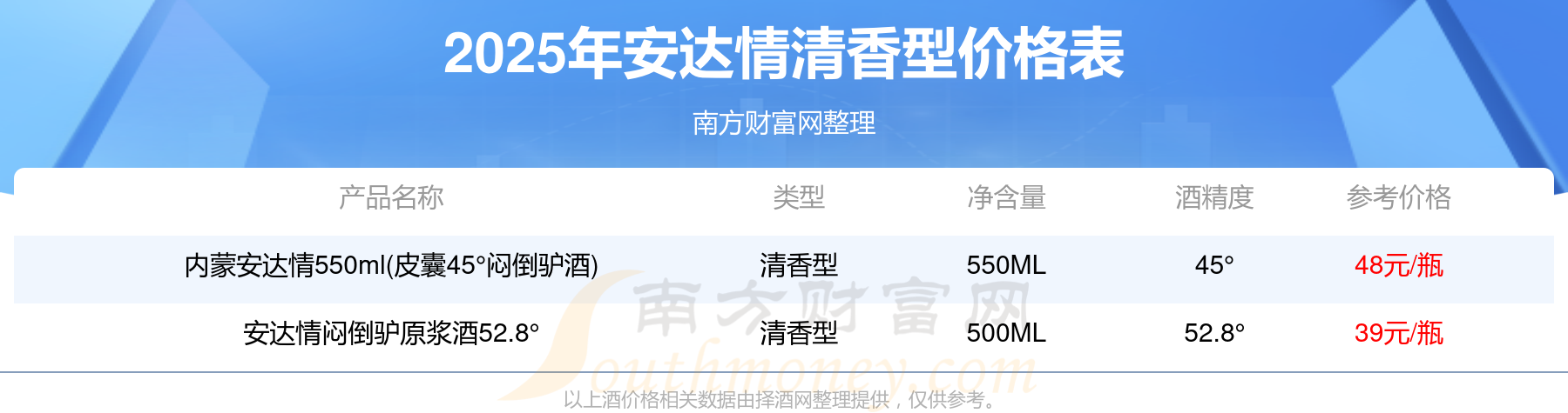 2025年,安达情清香型酒价格最高的是内蒙安达情550ml(皮囊45°闷倒驴酒),参考价48元,最低的是安达情闷倒驴原浆酒52.8°,参考价39元,价格高低差为9元。