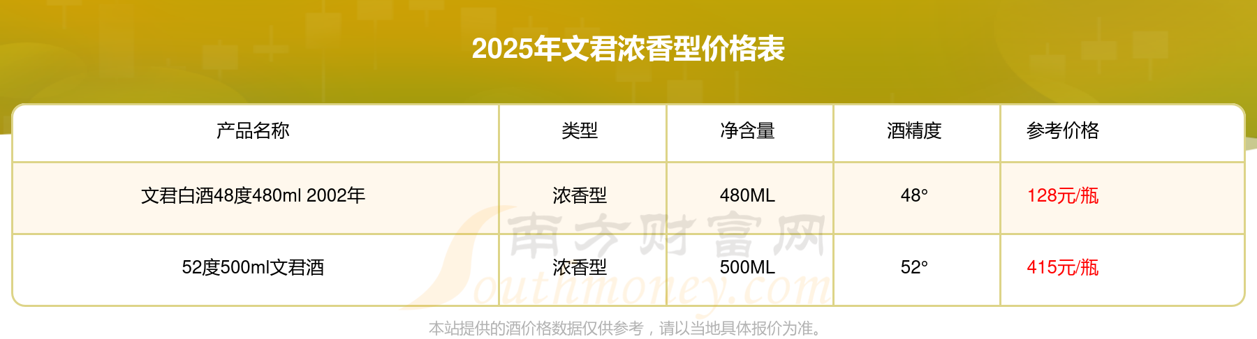2025年文君浓香型价格最高的酒是52度500ml文君酒,参考价415元/瓶,最低的是文君白酒48度480ml 2002年,参考价128元/瓶,价格高低差为287元/瓶。