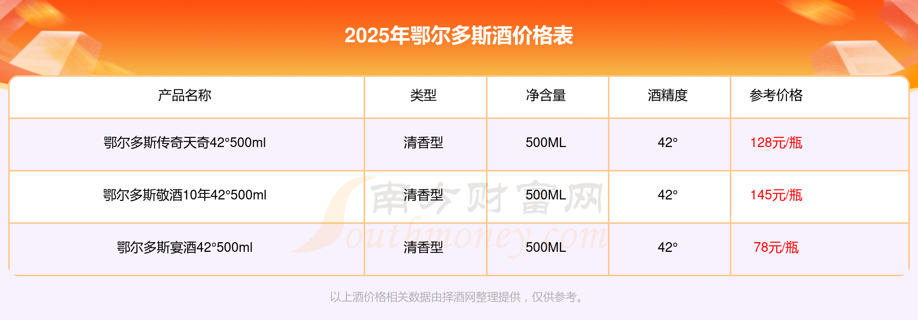 鄂尔多斯酒最新价格2025:鄂尔多斯敬酒10年42°500ml参考价145元/瓶、鄂尔多斯传奇天奇42°500ml参考价128元/瓶、鄂尔多斯宴酒42°500ml参考价78元/瓶。