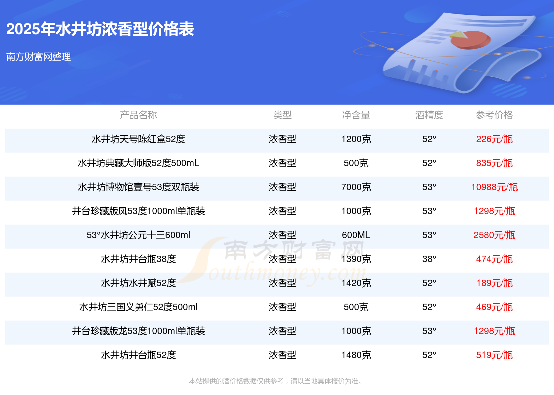 2025年,水井坊浓香型酒价格最高的是水井坊大坛收藏级原浆天球瓶66度,参考价13999元,最低的是水井坊小水井52度500ml,参考价158元,价格高低差为13841元。