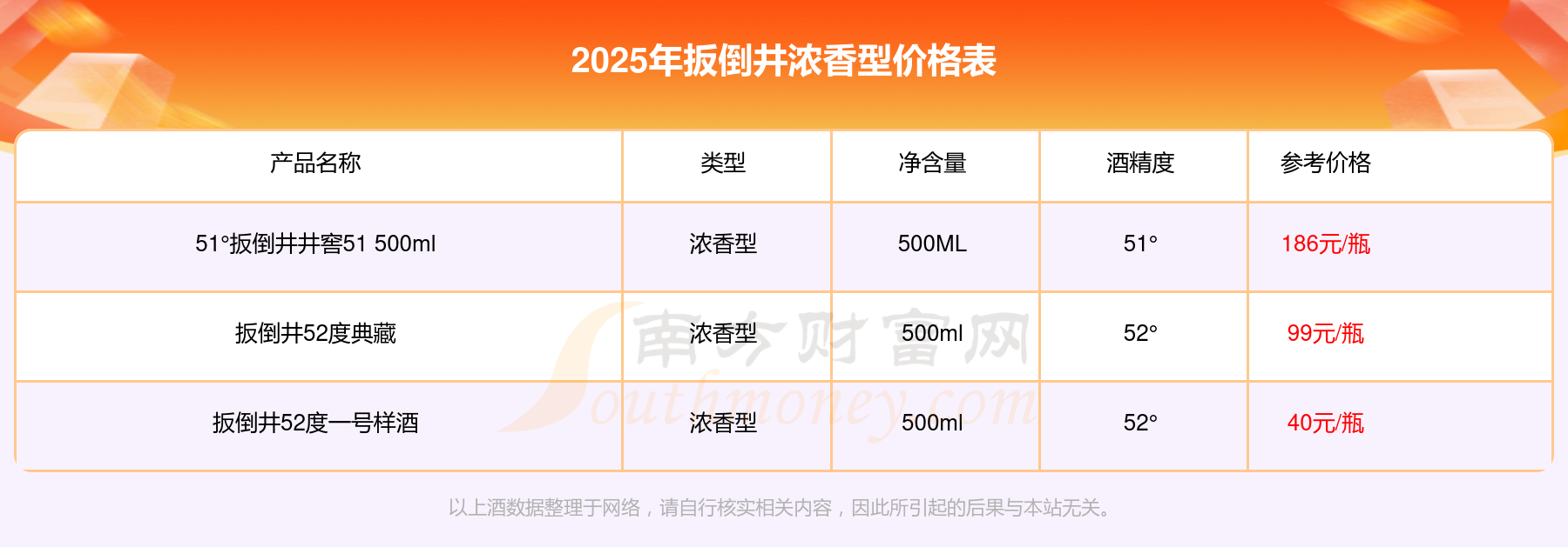 2025年扳倒井浓香型酒51°扳倒井井窖51 500ml、扳倒井52度典藏、扳倒井52度一号样酒等最新价格如下: