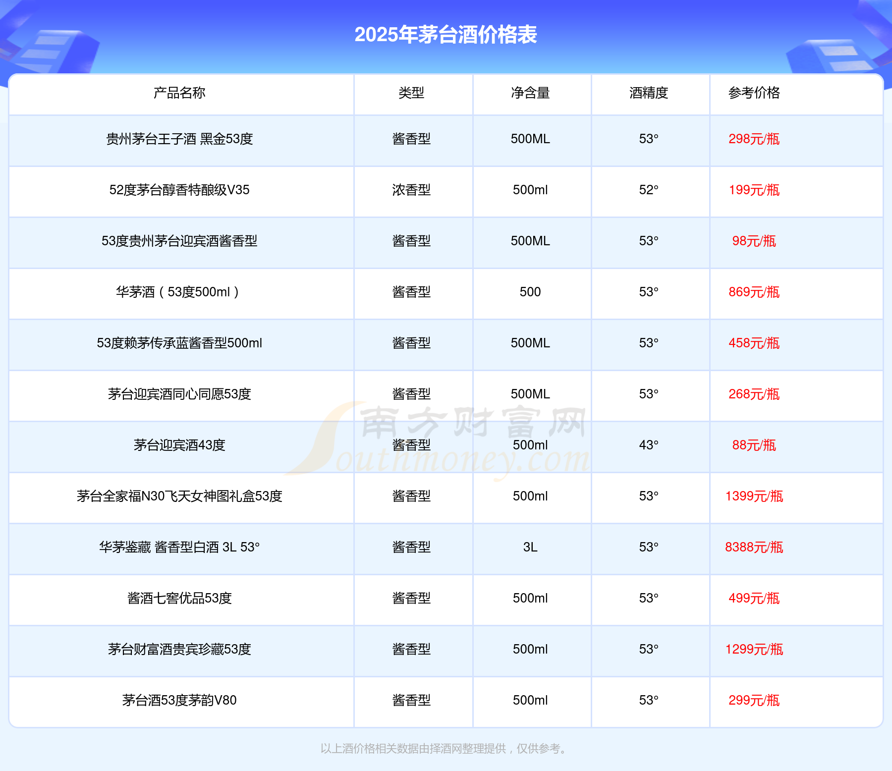2025年茅台酒华茅鉴藏 酱香型白酒 3L 53°、53度五星茅台生肖酒丁酉鸡年、贵州茅台己亥猪年生肖酒53°500ml等最新价格如下:华茅鉴藏 酱香型白酒 3L 53°参考价8388元/瓶、53度五星茅台生肖酒丁酉鸡年参考价2798元/瓶、贵州茅台己亥猪年生肖酒53°500ml参考价2699元/瓶。