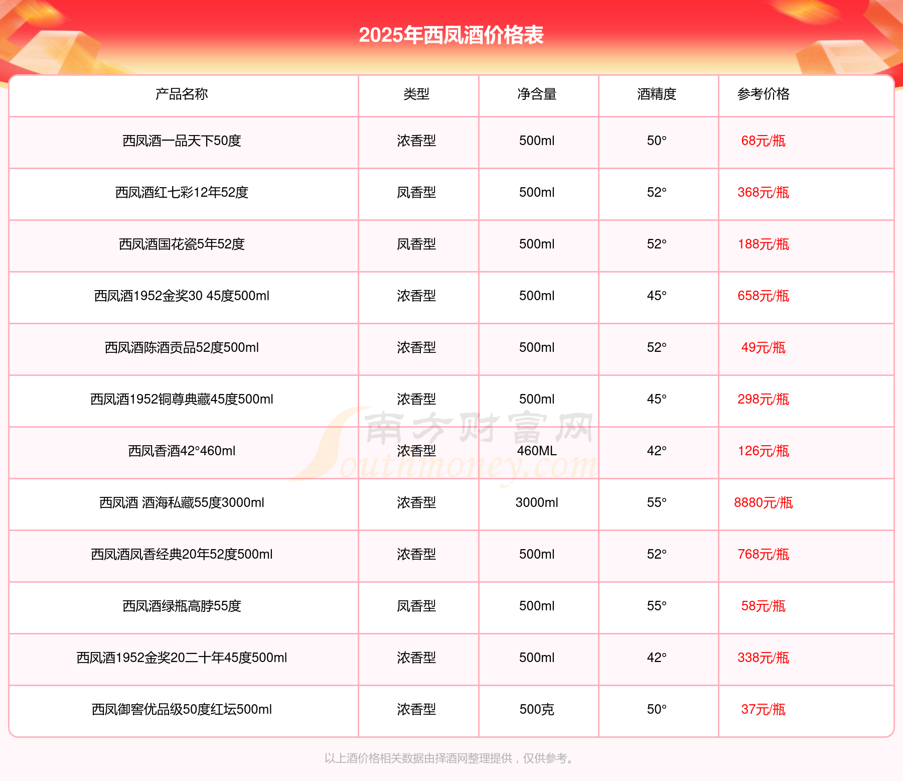西凤酒 酒海私藏55度3000ml参考价8880元/瓶、西凤酒1952金奖50 55度500ml参考价2380元/瓶、西凤酒2013年产老酒凤香经典30年52度500ml参考价1280元/瓶、西凤酒1956钻石藏45度500ml参考价980元/瓶、西凤酒1952金奖30 55度500ml参考价898元/瓶、西凤酒凤香经典20年52度500ml参考价768元/瓶、西凤酒1952金奖30 45度500ml参考价658元/瓶。