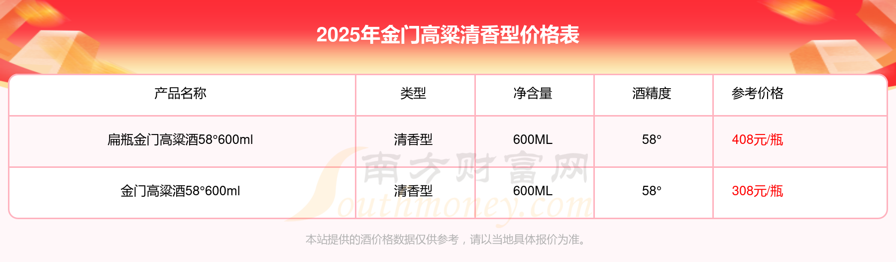 2025年,金门高粱清香型酒价格最高的是扁瓶金门高粱酒58°600ml,参考价408元,最低的是金门高粱酒58°600ml,参考价308元,价格高低差为100元。