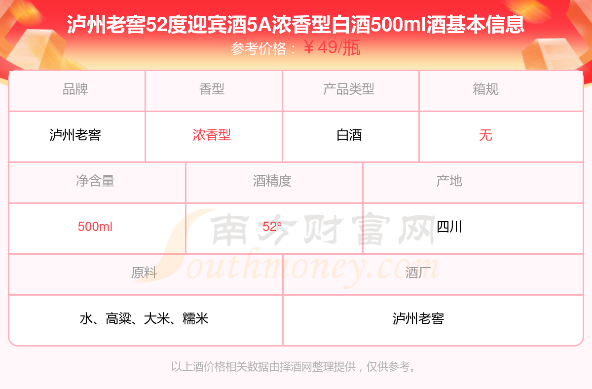泸州老窖52度迎宾酒5A浓香型白酒500ml基本信息