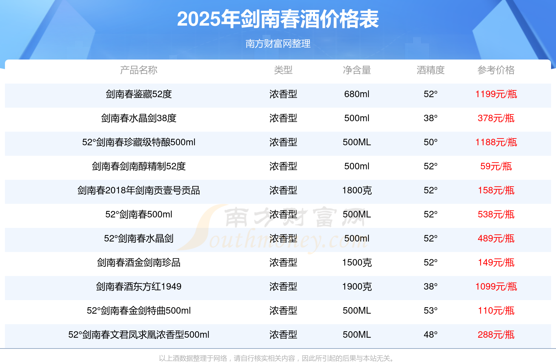 剑南春鉴藏52度参考价1199元/瓶、52°剑南春珍藏级特酿500ml参考价1188元/瓶、剑南春酒东方红1949参考价1099元/瓶。