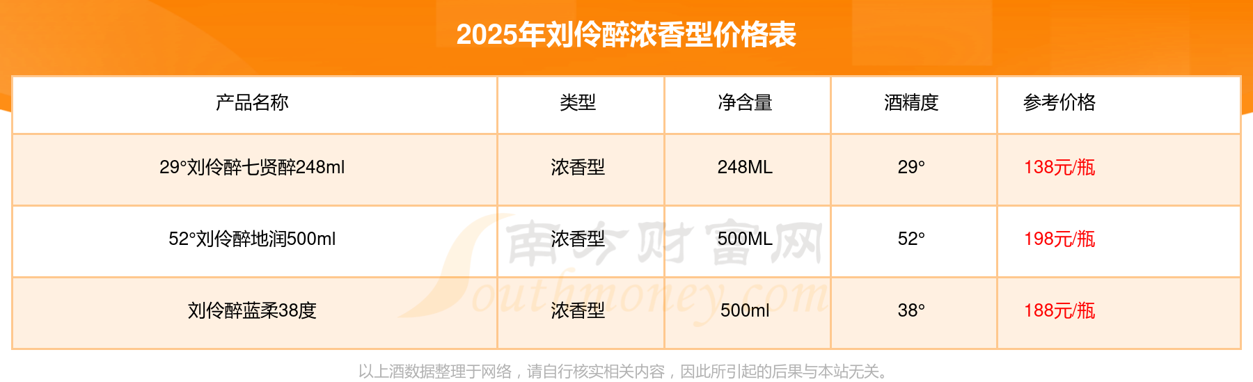 52°刘伶醉地润500ml参考价198元/瓶、刘伶醉蓝柔38度参考价188元/瓶、29°刘伶醉七贤醉248ml参考价138元/瓶。