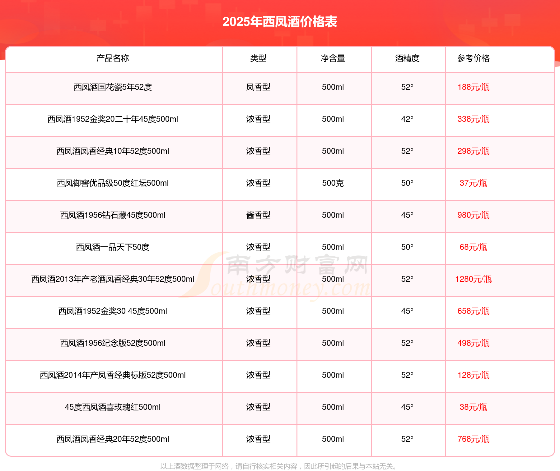 2025年西凤酒西凤酒 酒海私藏55度3000ml、西凤酒1952金奖50 55度500ml、西凤酒2013年产老酒凤香经典30年52度500ml等最新价格如下:西凤酒 酒海私藏55度3000ml参考价8880元/瓶、西凤酒1952金奖50 55度500ml参考价2380元/瓶、西凤酒2013年产老酒凤香经典30年52度500ml参考价1280元/瓶。