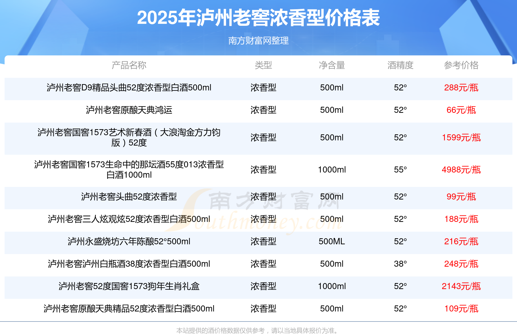 2025年,泸州老窖浓香型酒价格最高的是泸州老窖国窖1573春酿鼠兆丰年E 55度,参考价17999元,最低的是泸州老窖45度五洲醉8窖经典小酒版浓香型100ml,参考价10元,价格高低差为17989元。