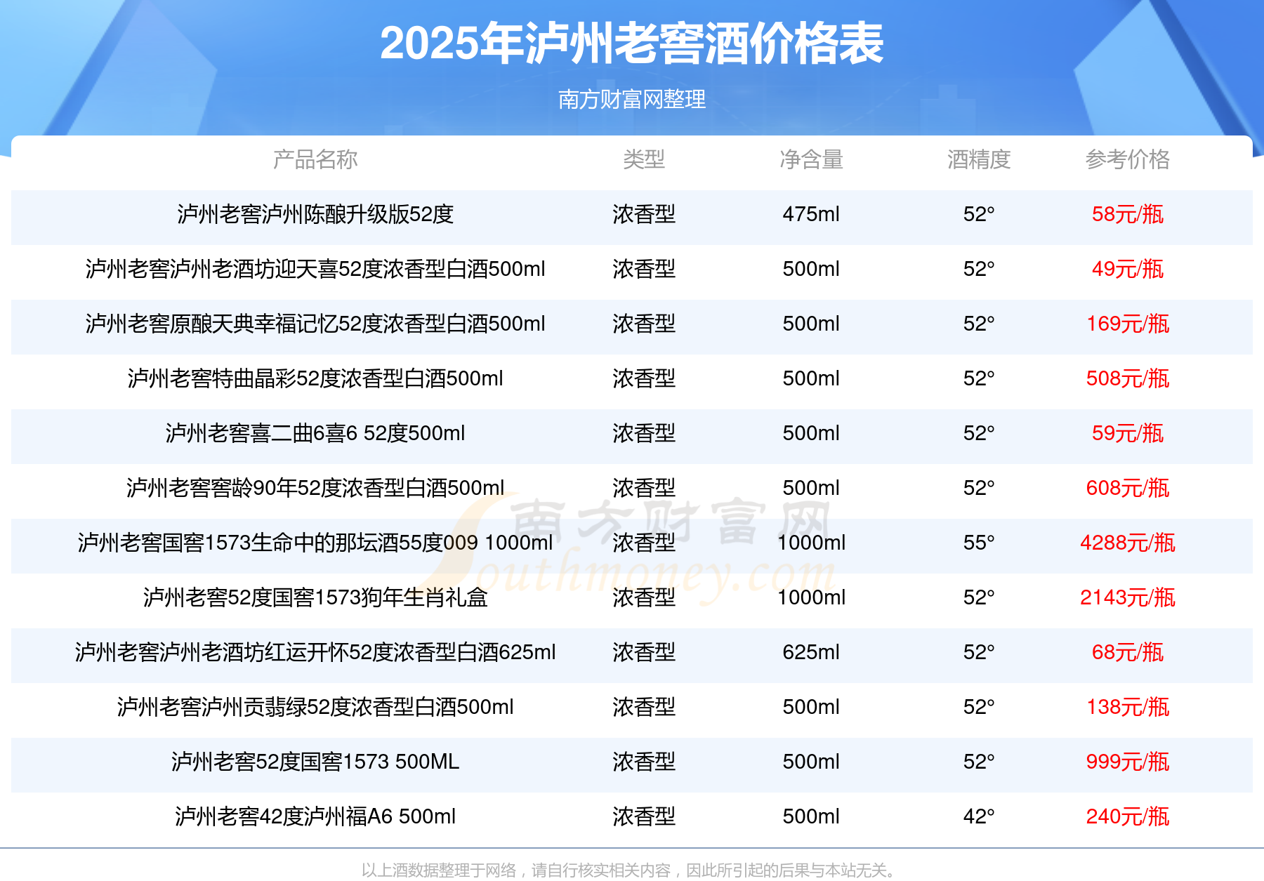 2025泸州老窖酒最新价格:泸州老窖国窖1573春酿鼠兆丰年E 55度参考价17999元/瓶、泸州老窖国窖1573生命中的那坛酒55度014参考价9999元/瓶、泸州老窖国窖1573春酿鼠兆丰年A 55度参考价5088元/瓶、泸州老窖国窖1573生命中的那坛酒55度013浓香型白酒1000ml参考价4988元/瓶。