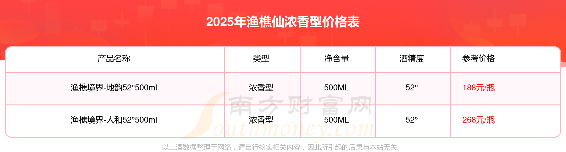 2025年,渔樵仙浓香型酒价格最高的是渔樵境界-人和52°500ml,参考价268元,最低的是渔樵境界-地韵52°500ml,参考价188元,价格高低差为80元。