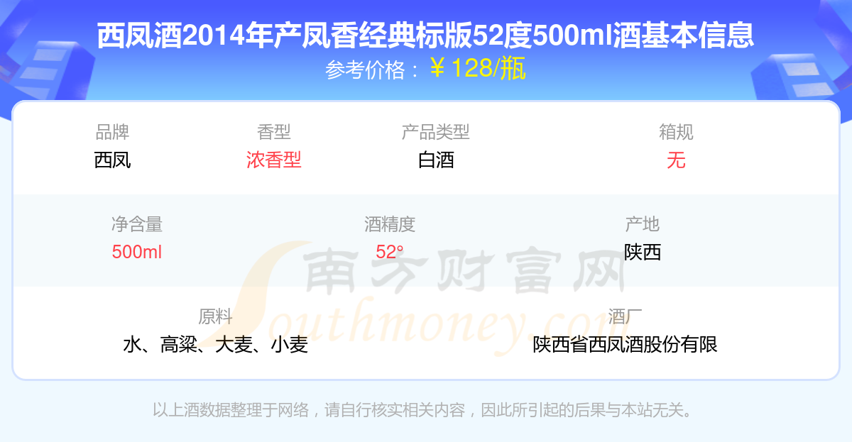 西凤酒2014年产凤香经典标版52度500ml基本信息