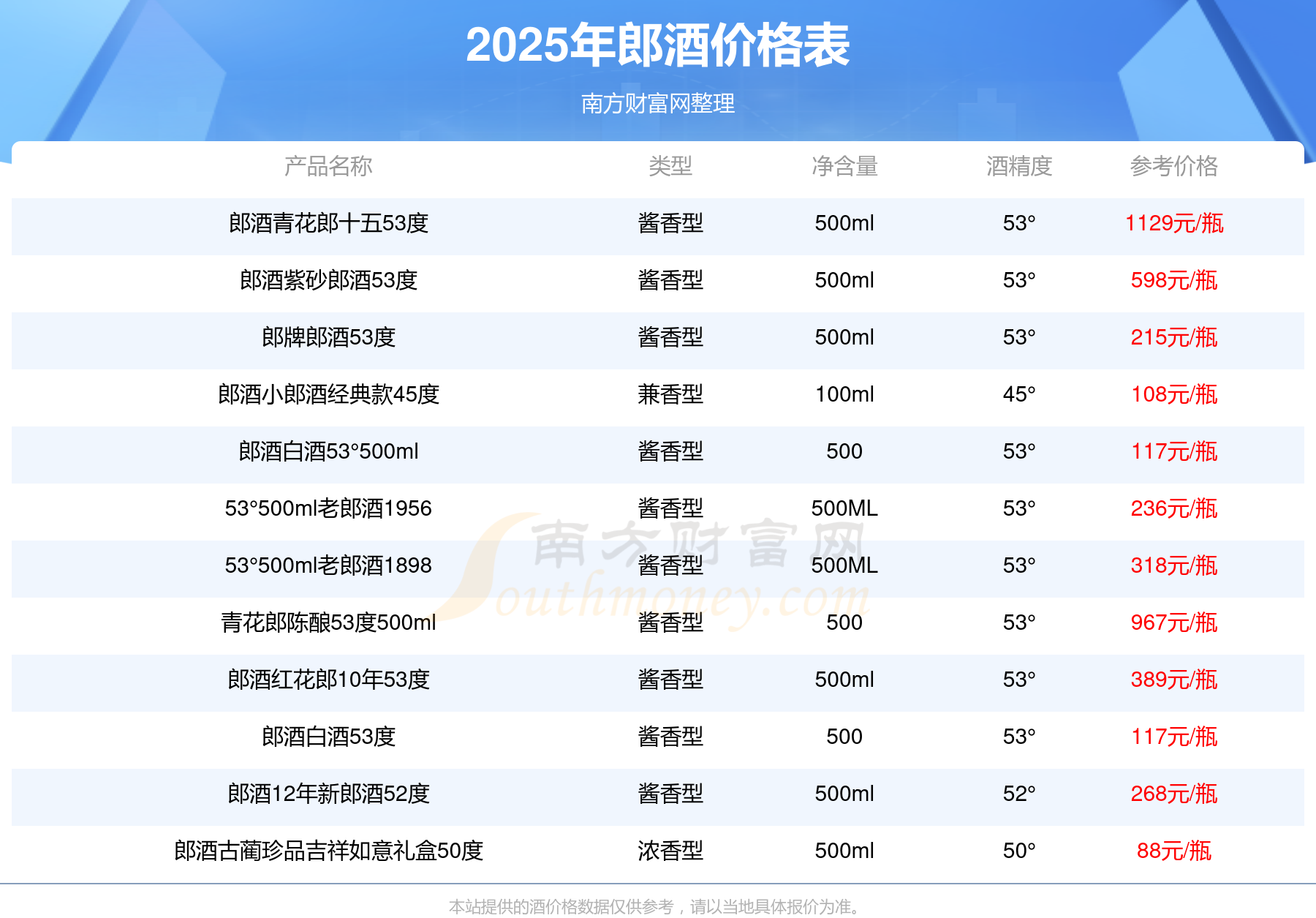 郎酒青花郎十五53度参考价1129元/瓶、青花郎陈酿53度500ml参考价967元/瓶、郎酒紫砂郎酒53度参考价598元/瓶、郎酒红花郎10年53度参考价389元/瓶。