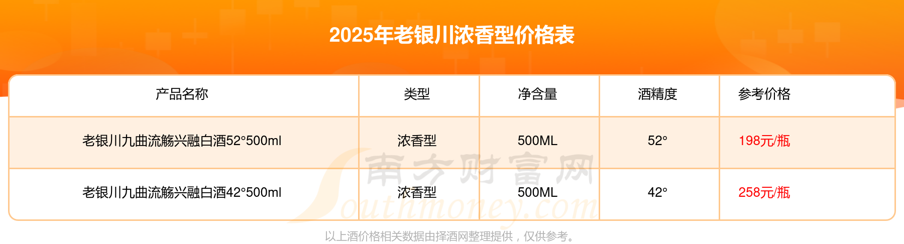 2025年老银川浓香型酒老银川九曲流觞兴融白酒42°500ml、老银川九曲流觞兴融白酒52°500ml等最新价格如下:老银川九曲流觞兴融白酒42°500ml参考价258元/瓶、老银川九曲流觞兴融白酒52°500ml参考价198元/瓶。