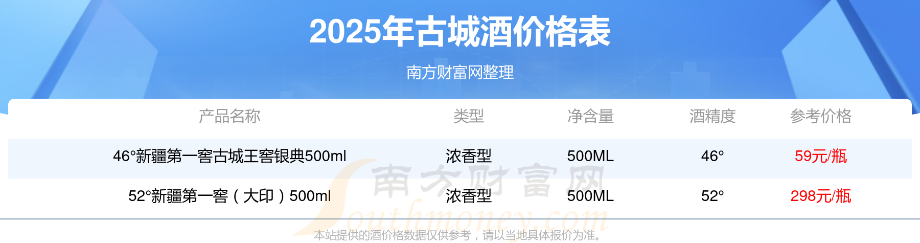 52°新疆第一窖(大印)500ml参考价298元/瓶、46°新疆第一窖古城王窖银典500ml参考价59元/瓶。