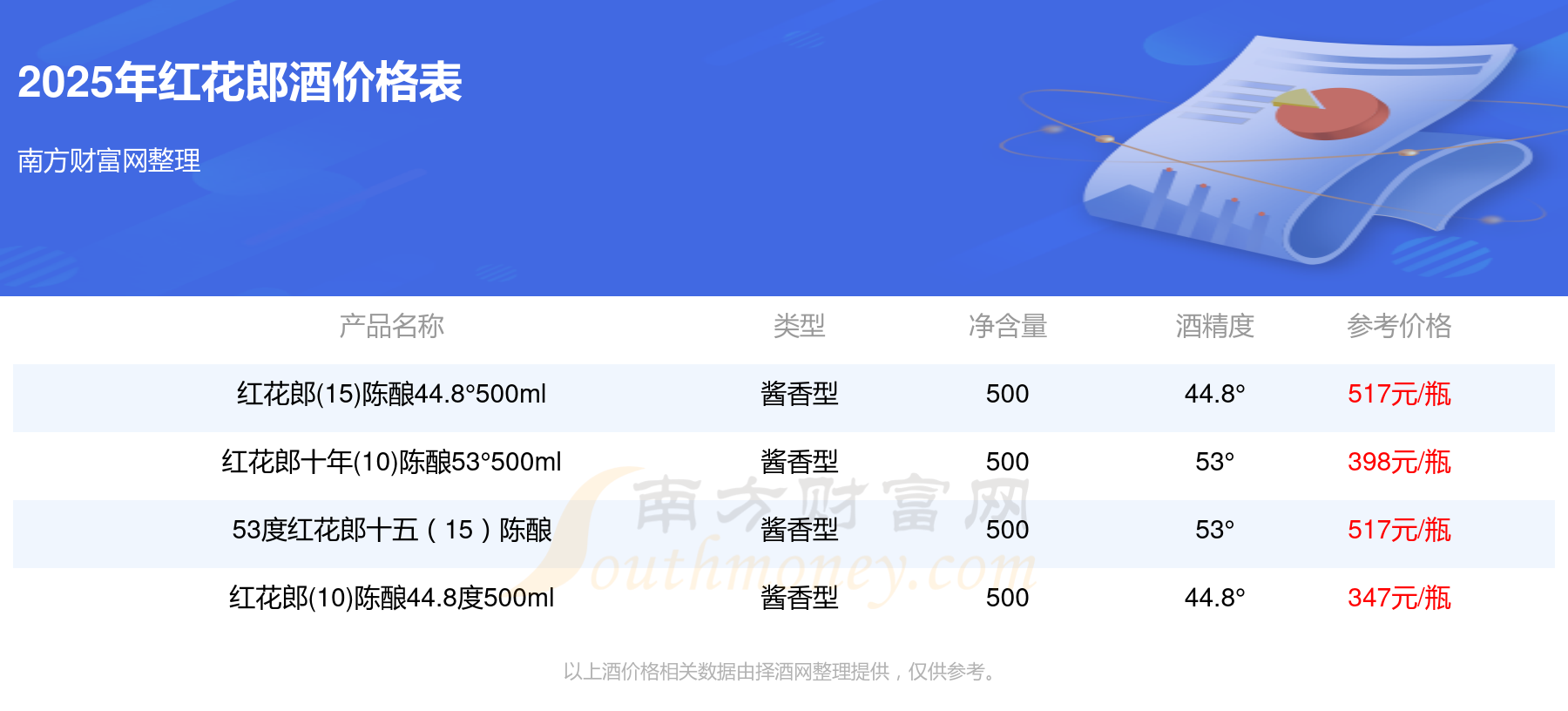 53度红花郎十五(15)陈酿参考价517元/瓶、红花郎(15)陈酿44.8°500ml参考价517元/瓶、红花郎十年(10)陈酿53°500ml参考价398元/瓶、红花郎(10)陈酿44.8度500ml参考价347元/瓶。