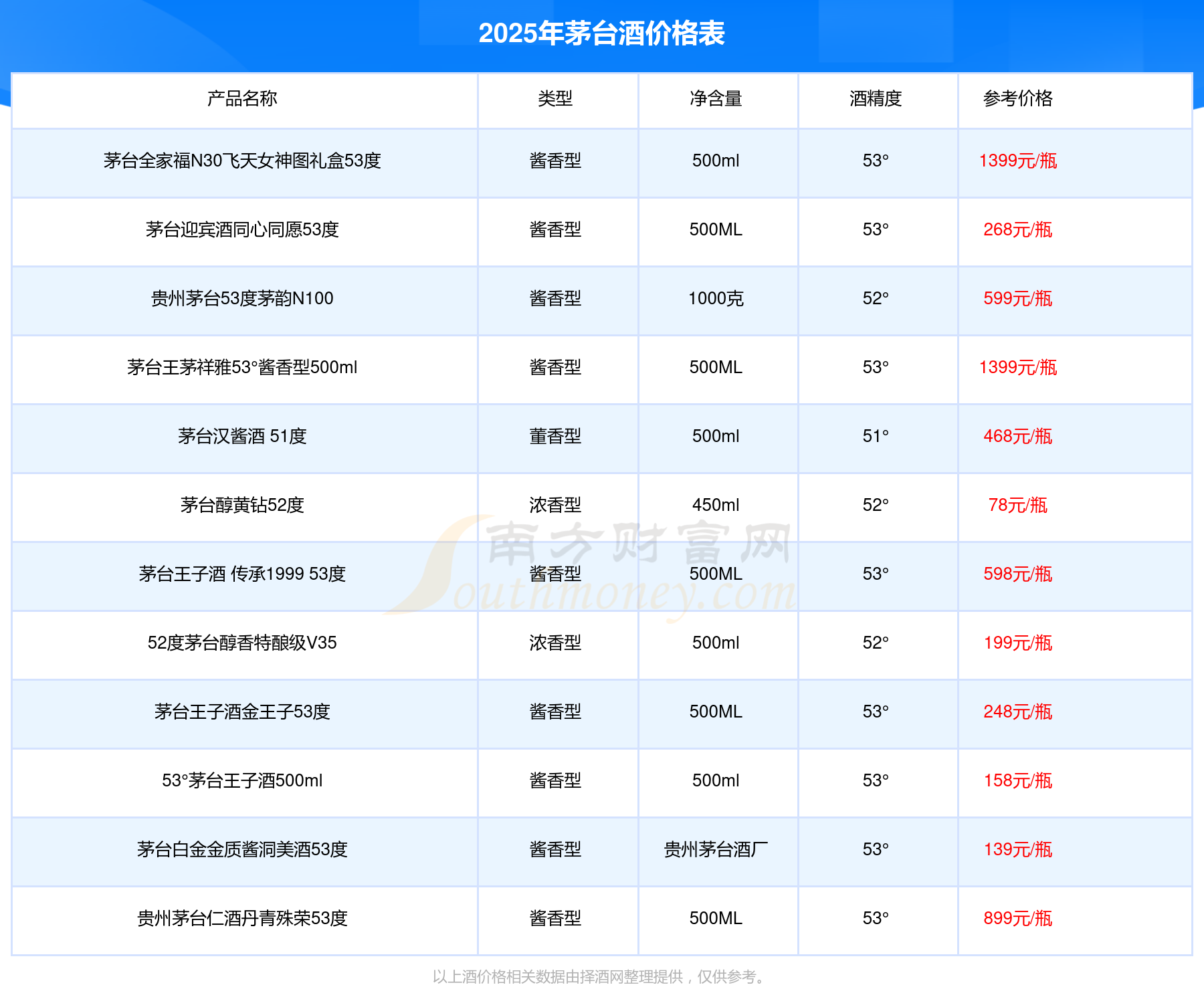 华茅鉴藏 酱香型白酒 3L 53°参考价8388元/瓶、53度五星茅台生肖酒丁酉鸡年参考价2798元/瓶、贵州茅台己亥猪年生肖酒53°500ml参考价2699元/瓶、53度五星茅台生肖酒戊戌狗年参考价2698元/瓶、飞天茅台53°500ml(2015年)参考价2199元/瓶、茅台王子酒己亥猪年生肖纪念酒53度2.5L参考价2099元/瓶、茅台1935酱香型53度参考价1799元/瓶。