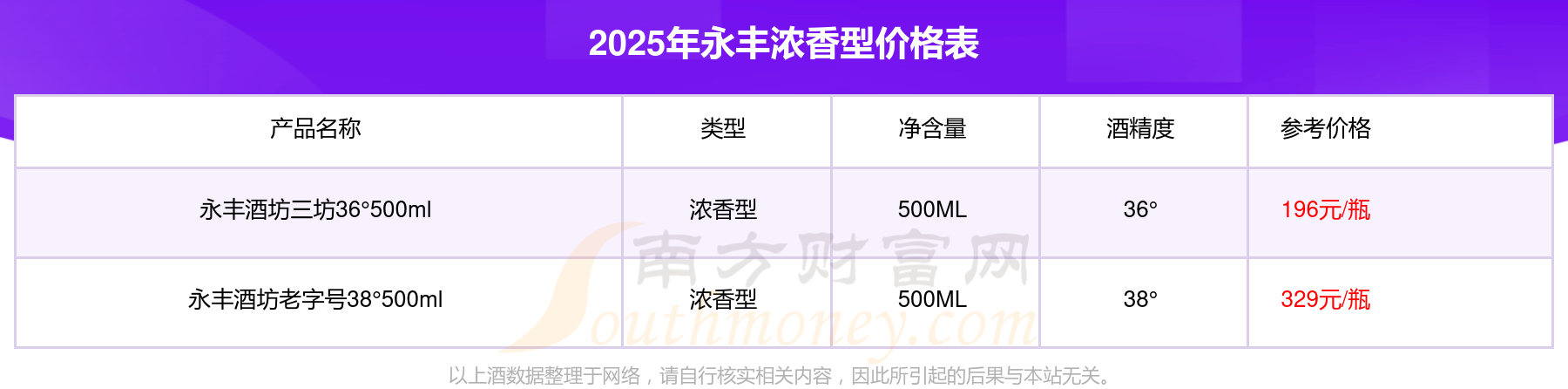 2025年永丰浓香型酒永丰酒坊老字号38°500ml、永丰酒坊三坊36°500ml等最新价格如下: