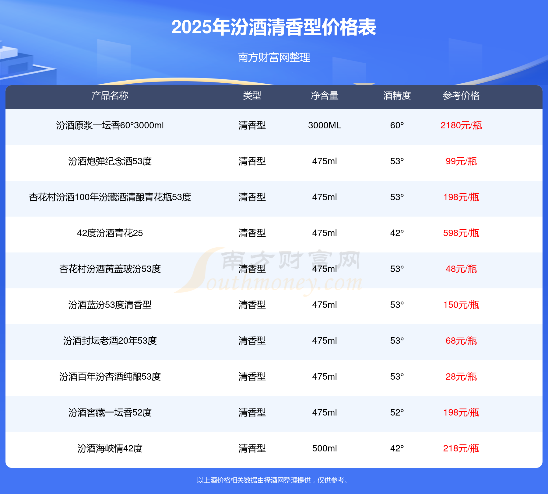 2025汾酒清香型酒最新价格:汾酒原浆一坛香60°3000ml参考价2180元/瓶、汾酒原浆一坛香60°1500ml参考价1536元/瓶、42度汾酒青花25参考价598元/瓶、汾酒收藏系列盘古汾酒55度参考价400元/瓶、汾酒关照原浆60度参考价399元/瓶、汾酒青花20单瓶礼盒装参考价388元/瓶。