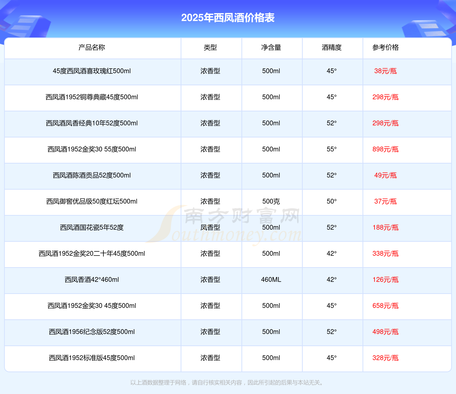 西凤酒 酒海私藏55度3000ml参考价8880元/瓶、西凤酒1952金奖50 55度500ml参考价2380元/瓶、西凤酒2013年产老酒凤香经典30年52度500ml参考价1280元/瓶、西凤酒1956钻石藏45度500ml参考价980元/瓶。