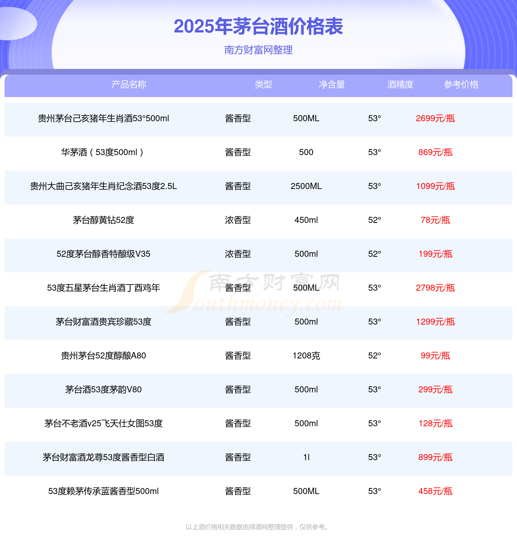 2025年,华茅鉴藏 酱香型白酒 3L 53°、53度五星茅台生肖酒丁酉鸡年、贵州茅台己亥猪年生肖酒53°500ml、53度五星茅台生肖酒戊戌狗年、飞天茅台53°500ml(2015年)、茅台王子酒己亥猪年生肖纪念酒53度2.5L、茅台1935酱香型53度、茅台财富贵宾典藏酒53度等茅台酒价格如下:华茅鉴藏 酱香型白酒 3L 53°参考价8388元/瓶、53度五星茅台生肖酒丁酉鸡年参考价2798元/瓶、贵州茅台己亥猪年生肖酒53°500ml参考价2699元/瓶、53度五星茅台生肖酒戊戌狗年参考价2698元/瓶、飞天茅台53°500ml(2015年)参考价2199元/瓶、茅台王子酒己亥猪年生肖纪念酒53度2.5L参考价2099元/瓶、茅台1935酱香型53度参考价1799元/瓶、茅台财富贵宾典藏酒53度参考价1599元/瓶。