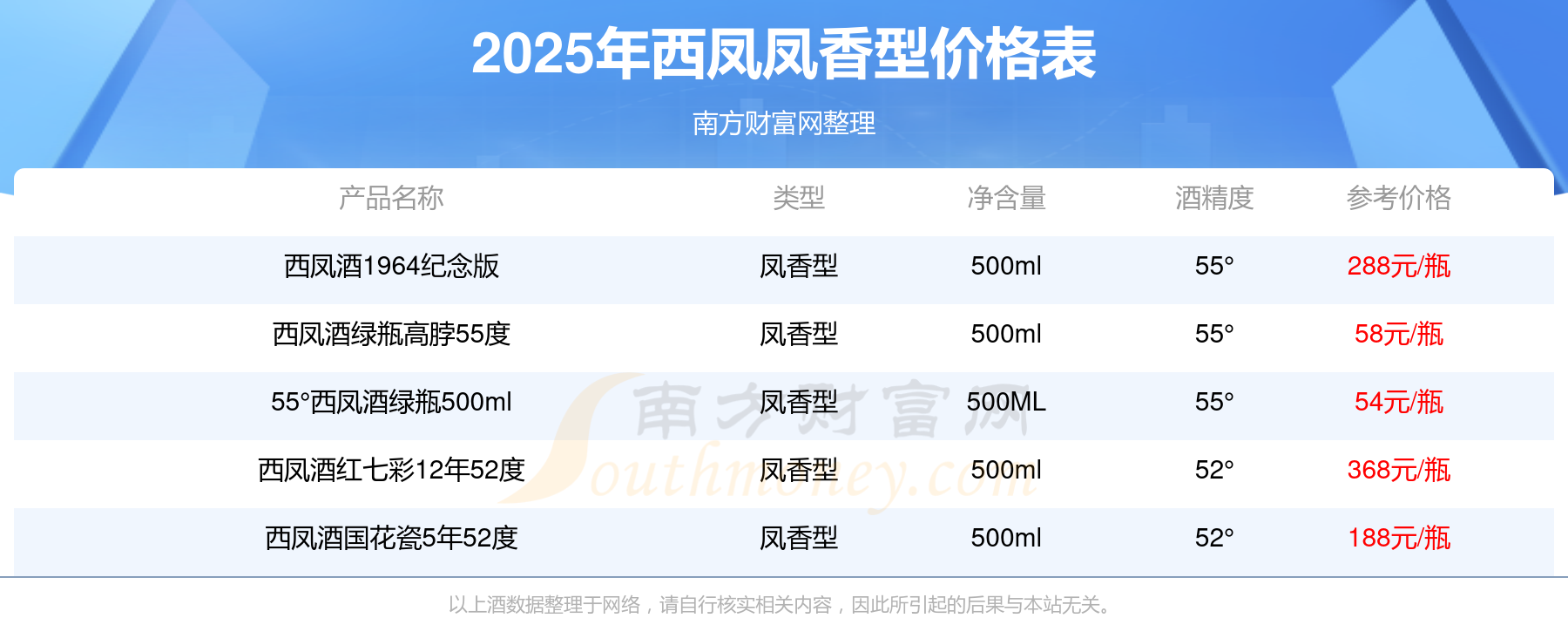 西凤酒红七彩12年52度参考价368元/瓶、西凤酒1964纪念版参考价288元/瓶、西凤酒国花瓷5年52度参考价188元/瓶、西凤酒绿瓶高脖55度参考价58元/瓶、55°西凤酒绿瓶500ml参考价54元/瓶。
