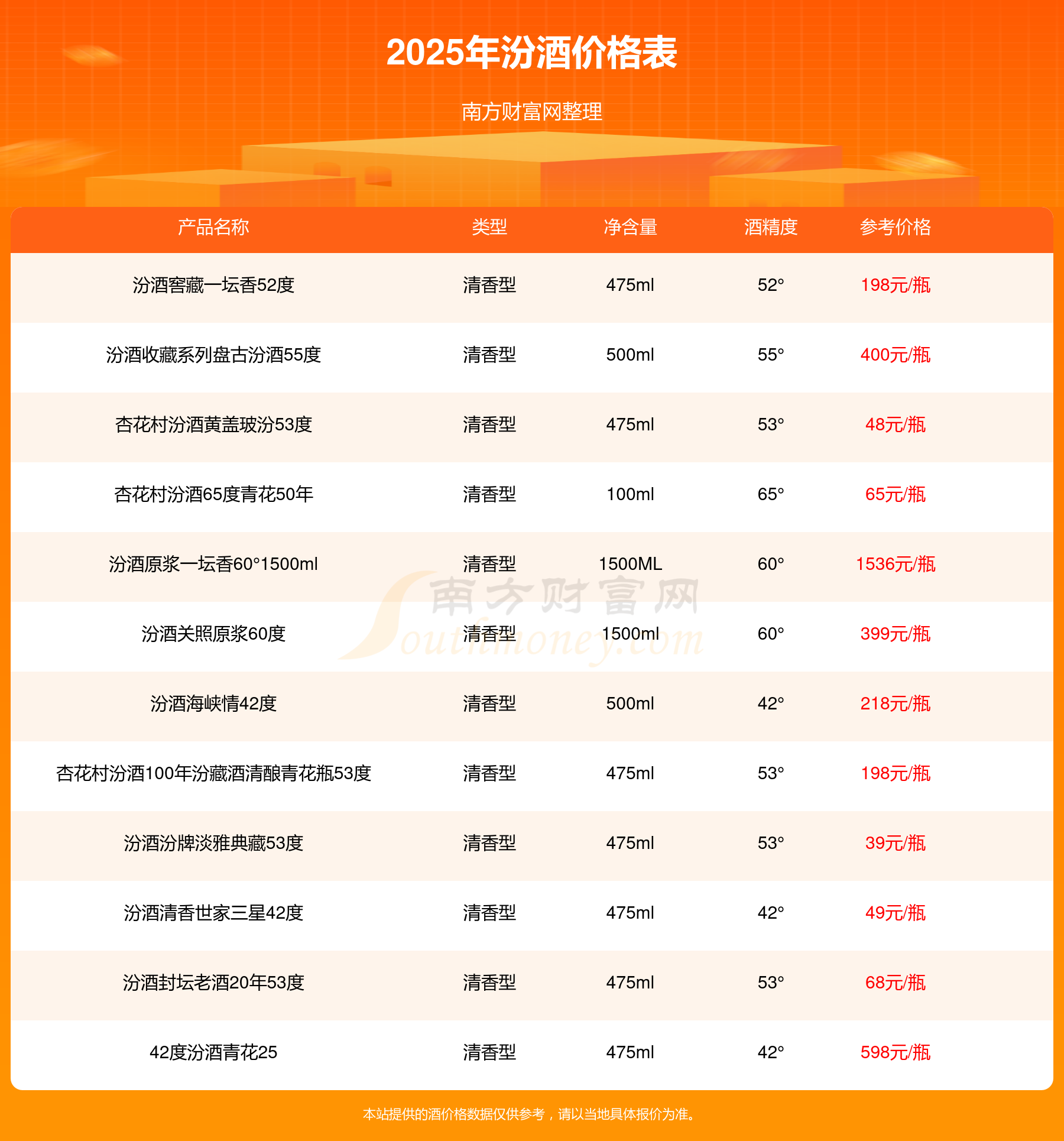 汾酒原浆一坛香60°3000ml参考价2180元/瓶、汾酒原浆一坛香60°1500ml参考价1536元/瓶、42度汾酒青花25参考价598元/瓶、汾酒收藏系列盘古汾酒55度参考价400元/瓶、汾酒关照原浆60度参考价399元/瓶。