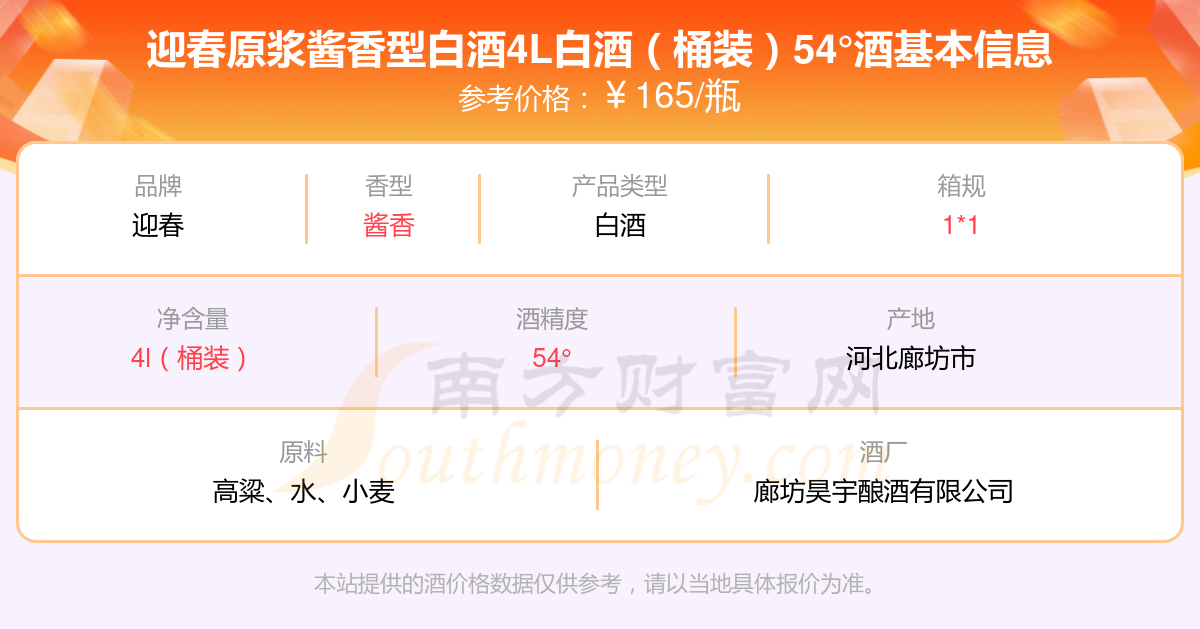 迎春原浆酱香型白酒4L白酒(桶装)54°基本信息
