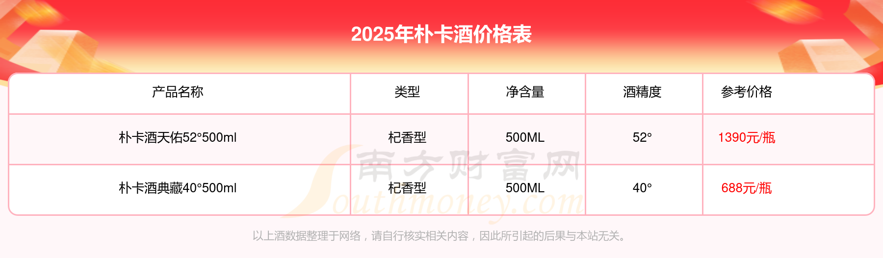 朴卡酒最新价格2025:朴卡酒天佑52°500ml参考价1390元/瓶、朴卡酒典藏40°500ml参考价688元/瓶。