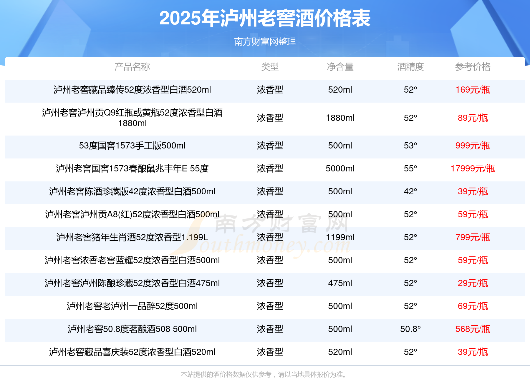 2025年泸州老窖酒泸州老窖国窖1573春酿鼠兆丰年E 55度、泸州老窖国窖1573生命中的那坛酒55度014、泸州老窖国窖1573春酿鼠兆丰年A 55度、泸州老窖国窖1573生命中的那坛酒55度013浓香型白酒1000ml、泸州老窖国窖1573生命中的那坛酒55度009 1000ml等最新价格如下:泸州老窖国窖1573春酿鼠兆丰年E 55度参考价17999元/瓶、泸州老窖国窖1573生命中的那坛酒55度014参考价9999元/瓶、泸州老窖国窖1573春酿鼠兆丰年A 55度参考价5088元/瓶、泸州老窖国窖1573生命中的那坛酒55度013浓香型白酒1000ml参考价4988元/瓶、泸州老窖国窖1573生命中的那坛酒55度009 1000ml参考价4288元/瓶。