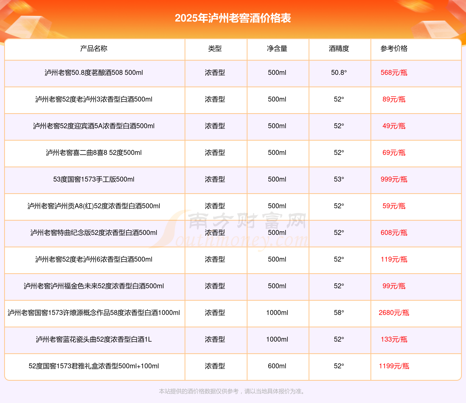 泸州老窖国窖1573春酿鼠兆丰年E 55度参考价17999元/瓶、泸州老窖国窖1573生命中的那坛酒55度014参考价9999元/瓶、泸州老窖国窖1573春酿鼠兆丰年A 55度参考价5088元/瓶、泸州老窖国窖1573生命中的那坛酒55度013浓香型白酒1000ml参考价4988元/瓶、泸州老窖国窖1573生命中的那坛酒55度009 1000ml参考价4288元/瓶、泸州老窖国窖1573中国品味52度浓香型白酒500ml参考价2888元/瓶、泸州老窖国窖1573许燎源概念作品58度浓香型白酒1000ml参考价2680元/瓶。