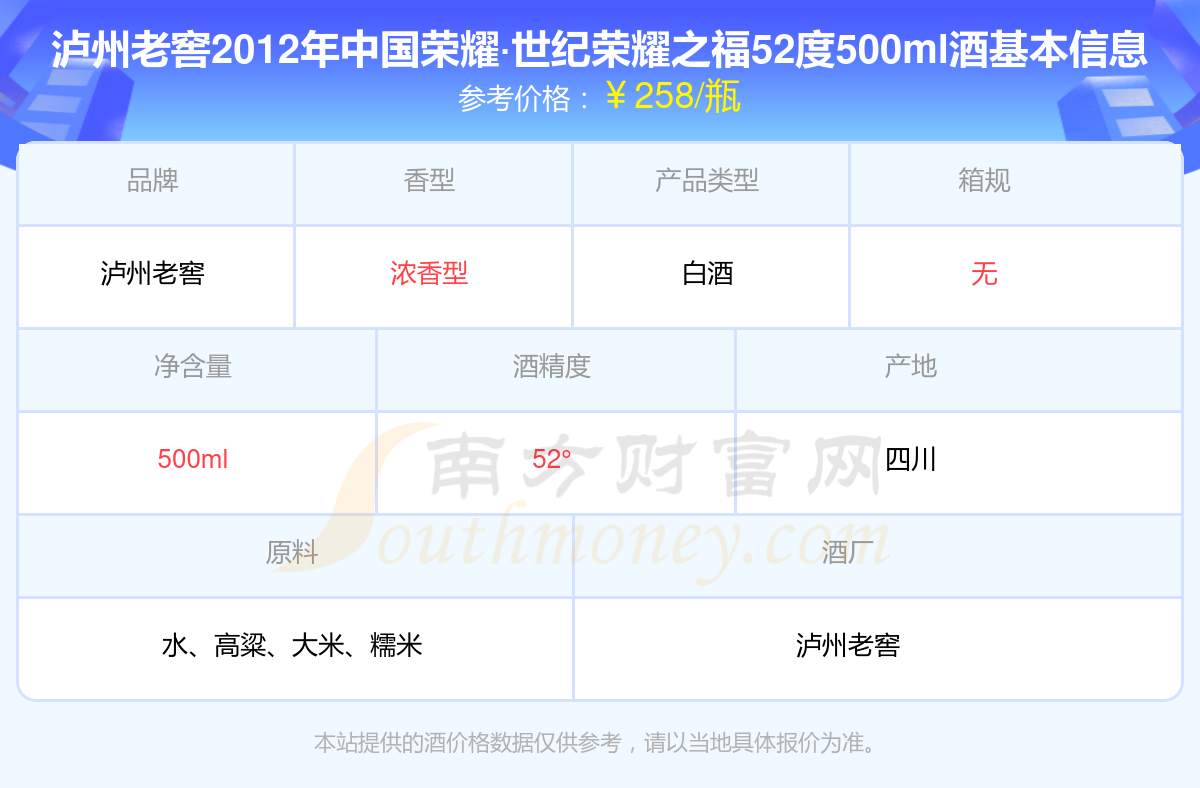 泸州老窖2012年中国荣耀·世纪荣耀之福52度500ml基本信息