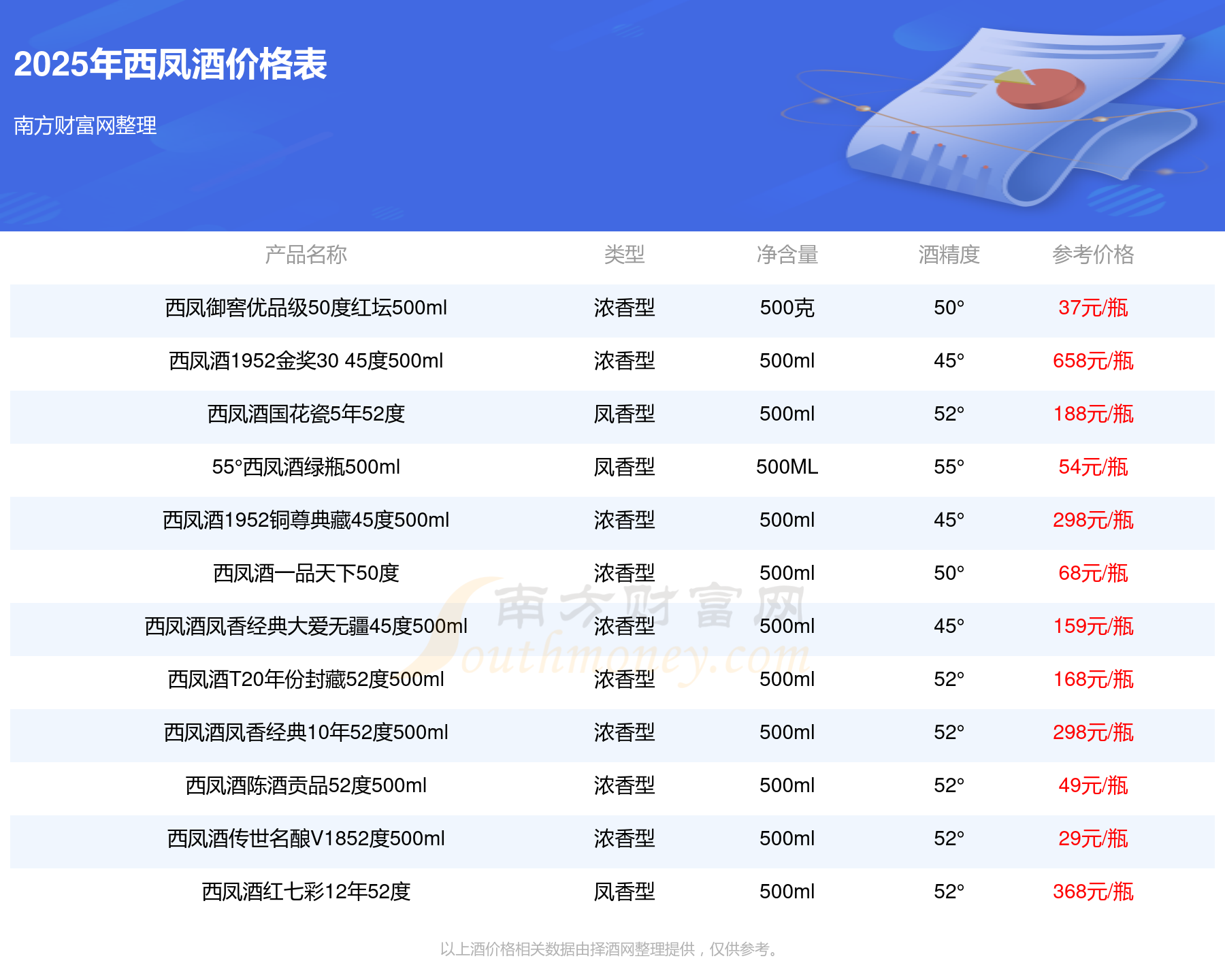 西凤酒 酒海私藏55度3000ml参考价8880元/瓶、西凤酒1952金奖50 55度500ml参考价2380元/瓶、西凤酒2013年产老酒凤香经典30年52度500ml参考价1280元/瓶、西凤酒1956钻石藏45度500ml参考价980元/瓶、西凤酒1952金奖30 55度500ml参考价898元/瓶、西凤酒凤香经典20年52度500ml参考价768元/瓶、西凤酒1952金奖30 45度500ml参考价658元/瓶、西凤酒1956纪念版52度500ml参考价498元/瓶。