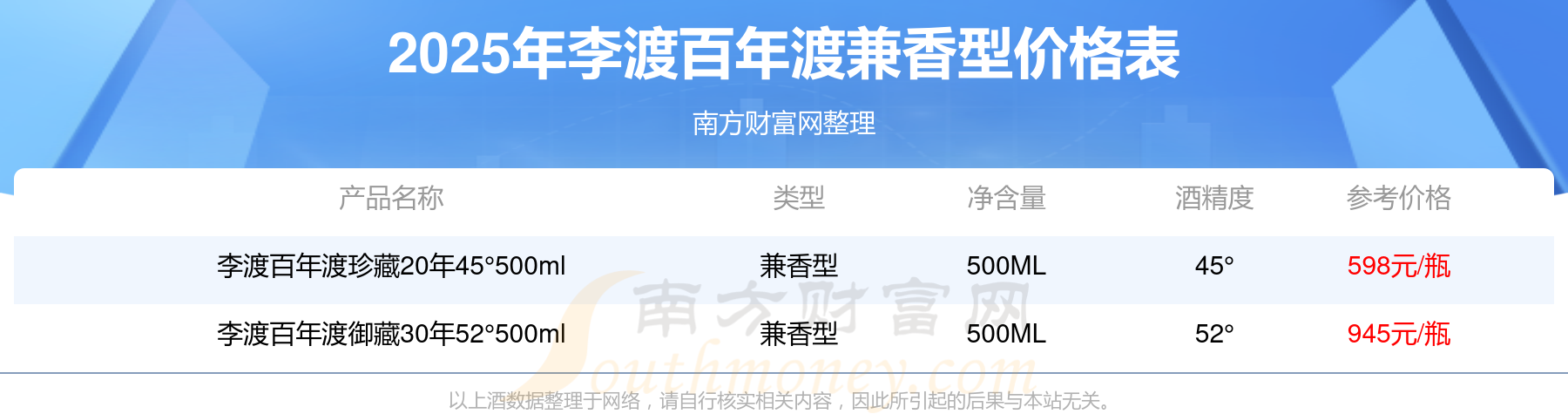 2025李渡百年渡兼香型酒最新价格:李渡百年渡御藏30年52°500ml参考价945元/瓶、李渡百年渡珍藏20年45°500ml参考价598元/瓶。