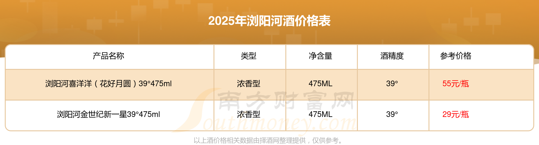 浏阳河喜洋洋(花好月圆)39°475ml参考价55元/瓶、浏阳河金世纪新一星39°475ml参考价29元/瓶。