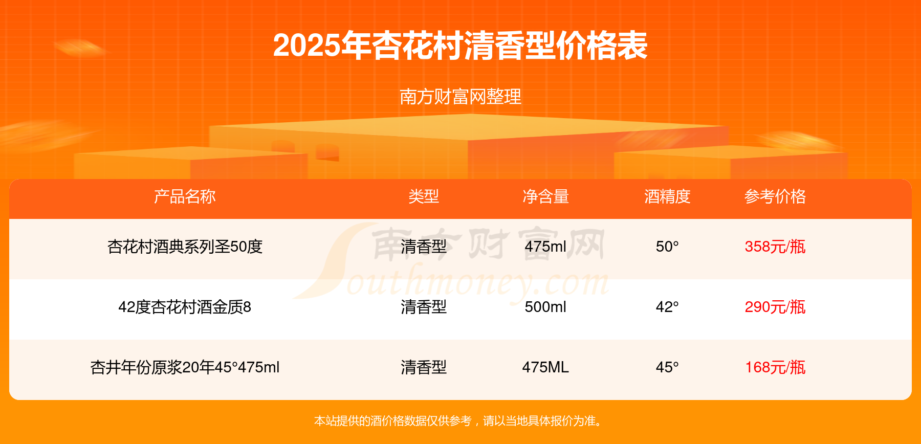 2025年,杏花村酒典系列圣50度、42度杏花村酒金质8、杏井年份原浆20年45°475ml等杏花村清香型酒价格如下:杏花村酒典系列圣50度参考价358元/瓶、42度杏花村酒金质8参考价290元/瓶、杏井年份原浆20年45°475ml参考价168元/瓶。