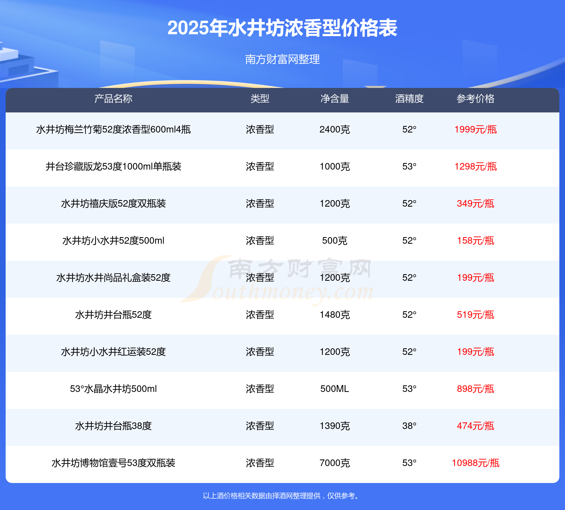 2025水井坊浓香型酒最新价格:水井坊大坛收藏级原浆天球瓶66度参考价13999元/瓶、水井坊博物馆壹号53度双瓶装参考价10988元/瓶、53°水井坊公元十三600ml参考价2580元/瓶、水井坊梅兰竹菊52度浓香型600ml4瓶参考价1999元/瓶、水井坊菁翠52度500ml参考价1650元/瓶、井台珍藏版龙53度1000ml单瓶装参考价1298元/瓶。
