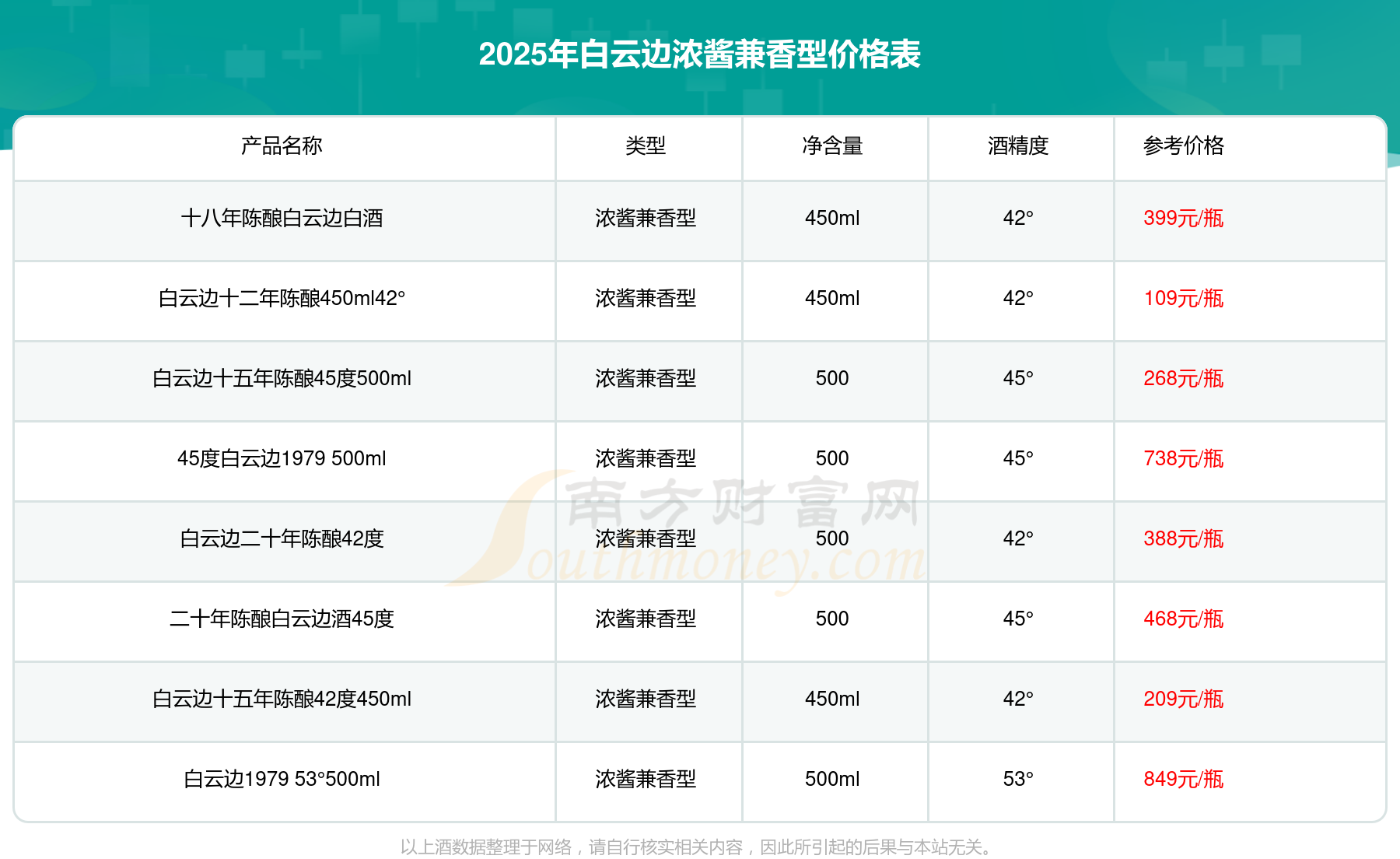 白云边1979 53°500ml参考价849元/瓶、45度白云边1979 500ml参考价738元/瓶、二十年陈酿白云边酒45度参考价468元/瓶、十八年陈酿白云边白酒参考价399元/瓶。