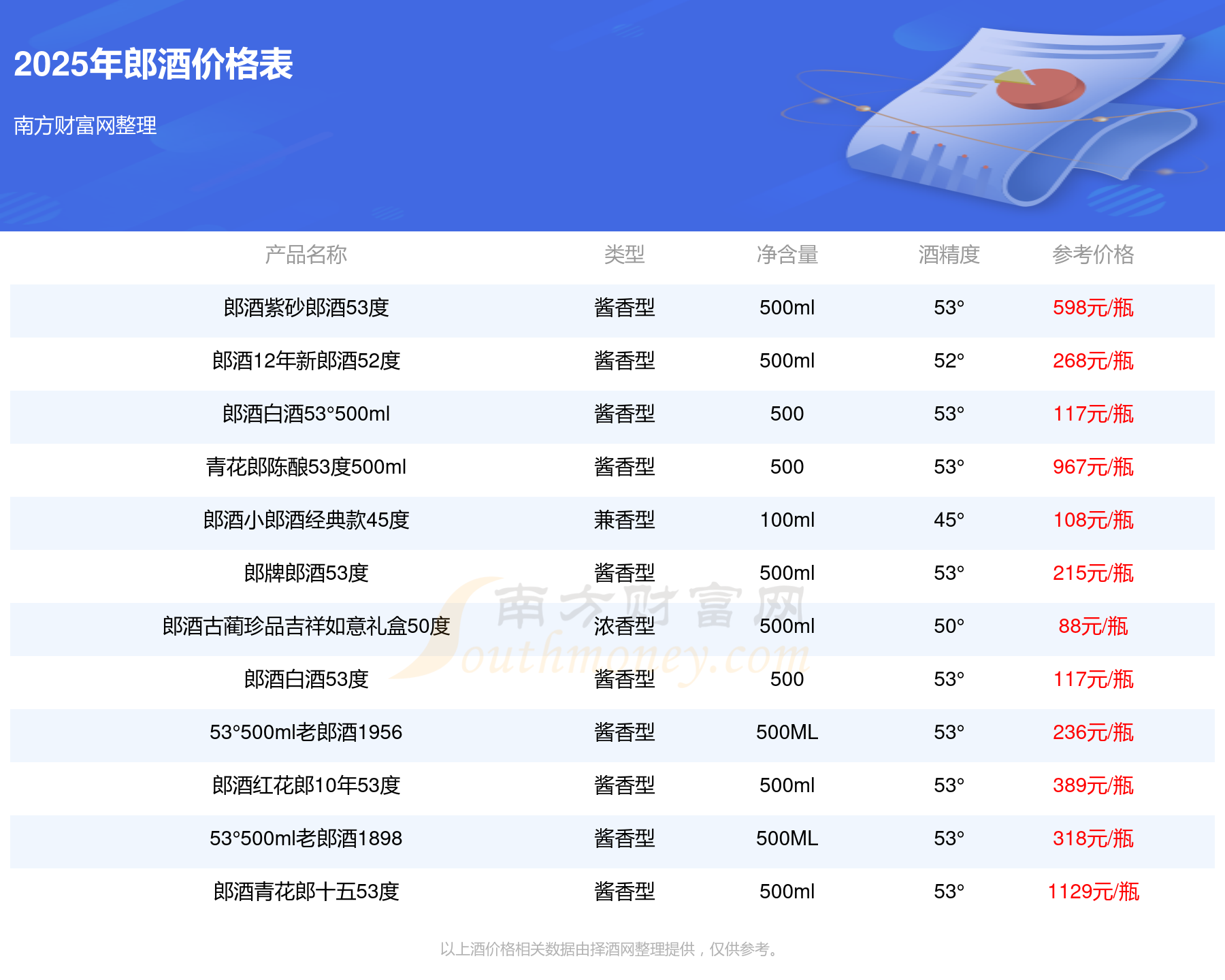 郎酒青花郎十五53度参考价1129元/瓶、青花郎陈酿53度500ml参考价967元/瓶、郎酒紫砂郎酒53度参考价598元/瓶、郎酒红花郎10年53度参考价389元/瓶、53°500ml老郎酒1898参考价318元/瓶、郎酒12年新郎酒52度参考价268元/瓶。
