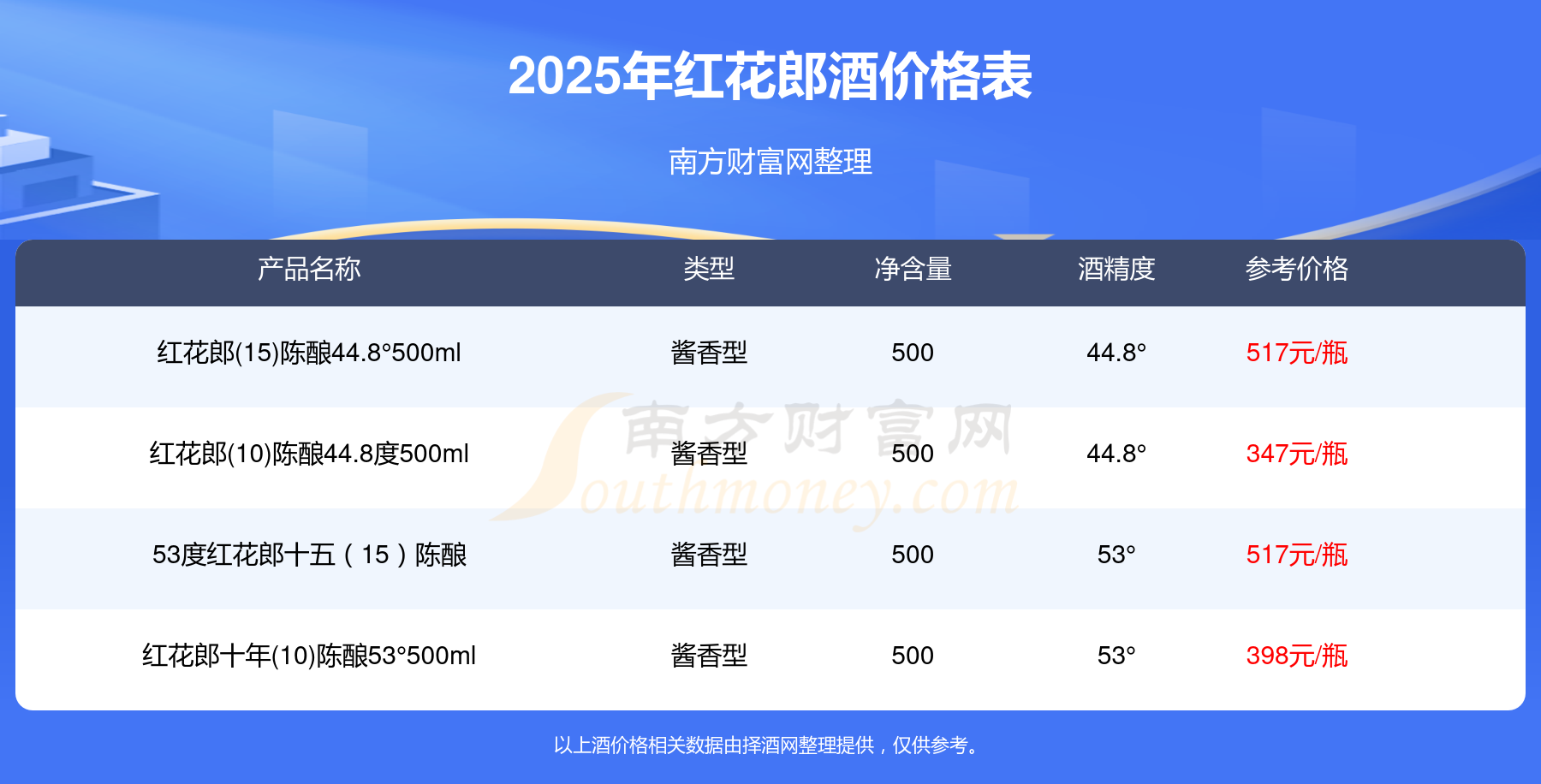 2025年,53度红花郎十五(15)陈酿、红花郎(15)陈酿44.8°500ml、红花郎十年(10)陈酿53°500ml、红花郎(10)陈酿44.8度500ml等红花郎酒价格如下:53度红花郎十五(15)陈酿参考价517元/瓶、红花郎(15)陈酿44.8°500ml参考价517元/瓶、红花郎十年(10)陈酿53°500ml参考价398元/瓶、红花郎(10)陈酿44.8度500ml参考价347元/瓶。
