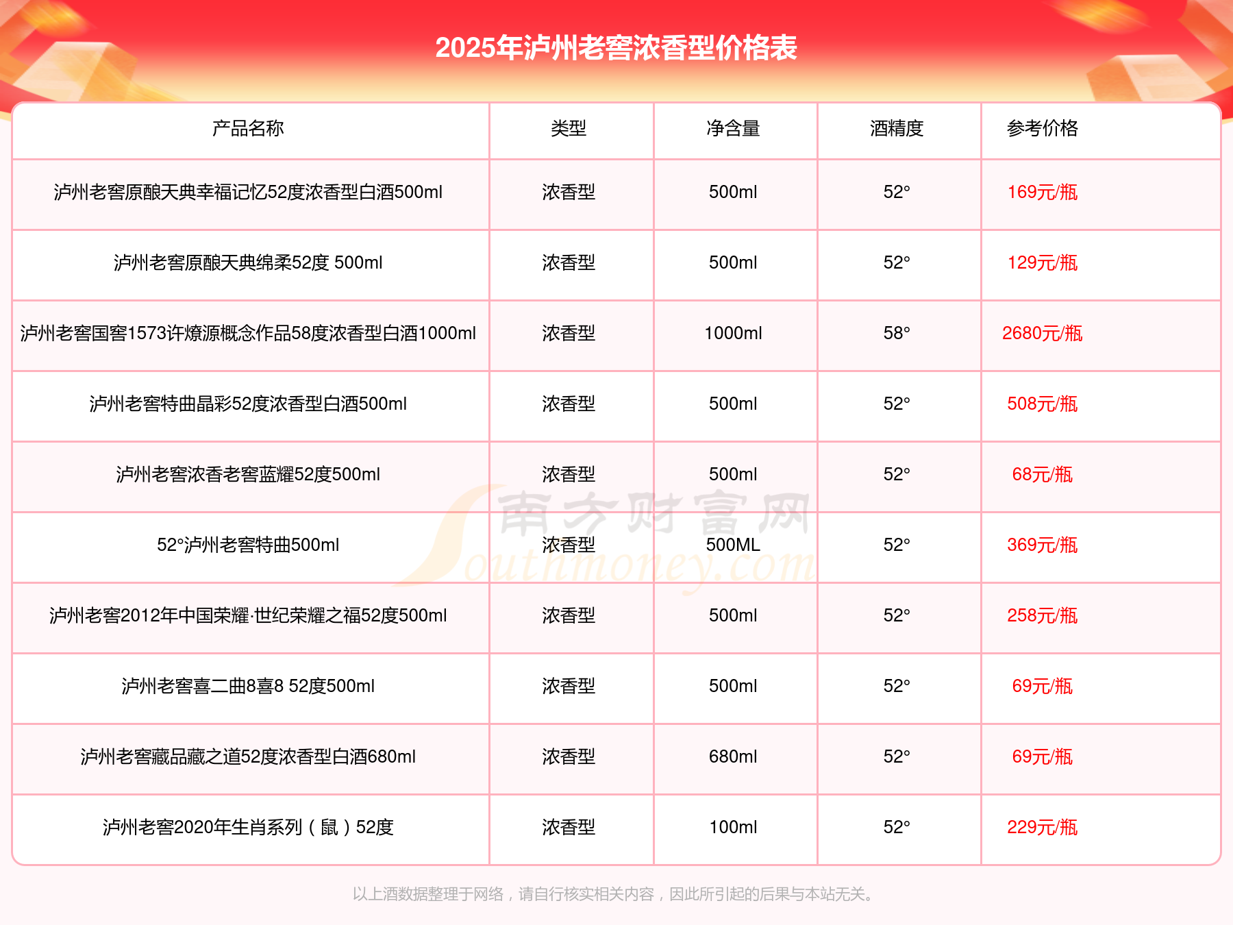 泸州老窖国窖1573春酿鼠兆丰年E 55度参考价17999元/瓶、泸州老窖国窖1573生命中的那坛酒55度014参考价9999元/瓶、泸州老窖国窖1573春酿鼠兆丰年A 55度参考价5088元/瓶、泸州老窖国窖1573生命中的那坛酒55度013浓香型白酒1000ml参考价4988元/瓶、泸州老窖国窖1573生命中的那坛酒55度009 1000ml参考价4288元/瓶、泸州老窖国窖1573中国品味52度浓香型白酒500ml参考价2888元/瓶。