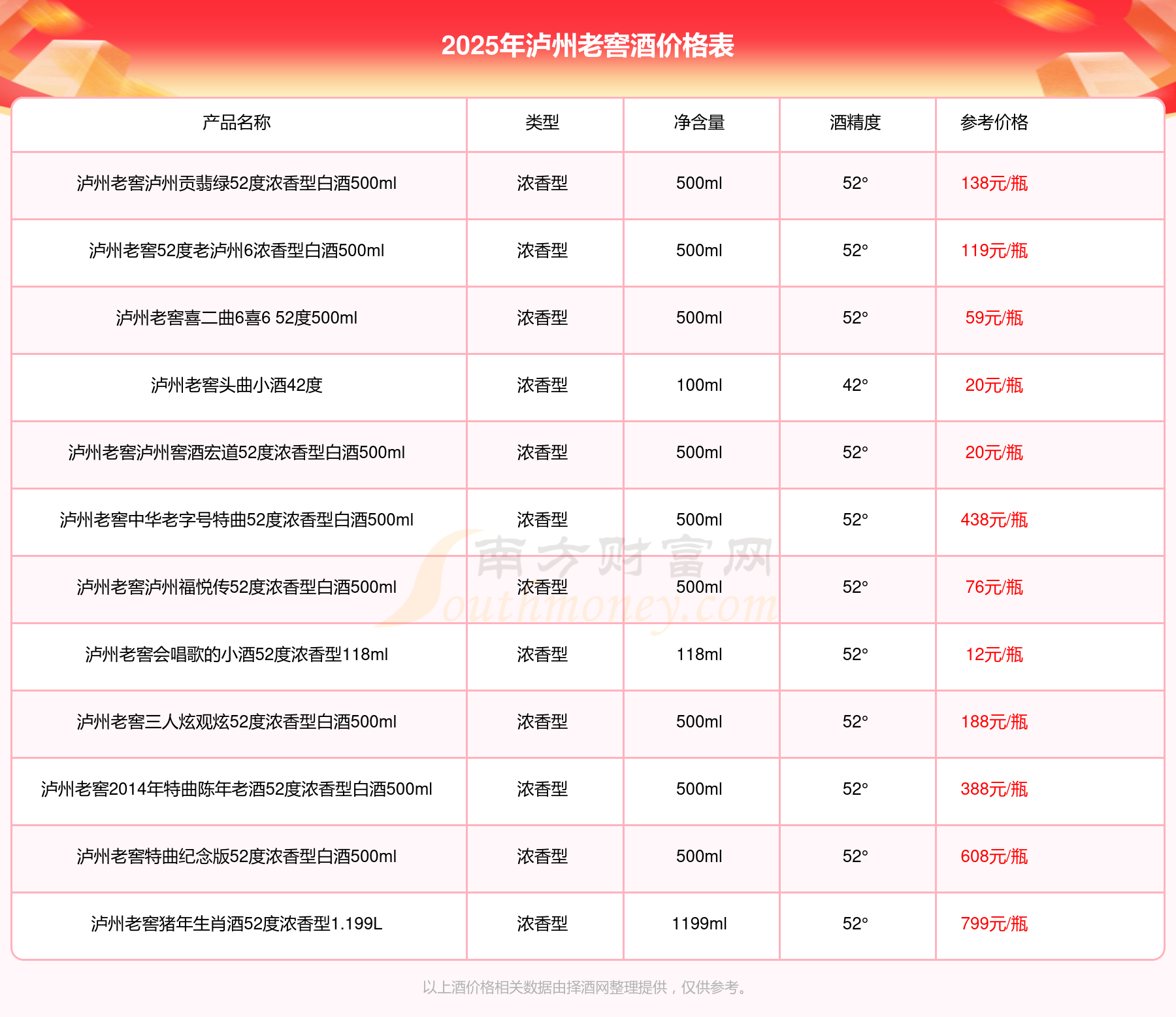 泸州老窖酒最新价格2025:泸州老窖国窖1573春酿鼠兆丰年E 55度参考价17999元/瓶、泸州老窖国窖1573生命中的那坛酒55度014参考价9999元/瓶、泸州老窖国窖1573春酿鼠兆丰年A 55度参考价5088元/瓶、泸州老窖国窖1573生命中的那坛酒55度013浓香型白酒1000ml参考价4988元/瓶、泸州老窖国窖1573生命中的那坛酒55度009 1000ml参考价4288元/瓶。